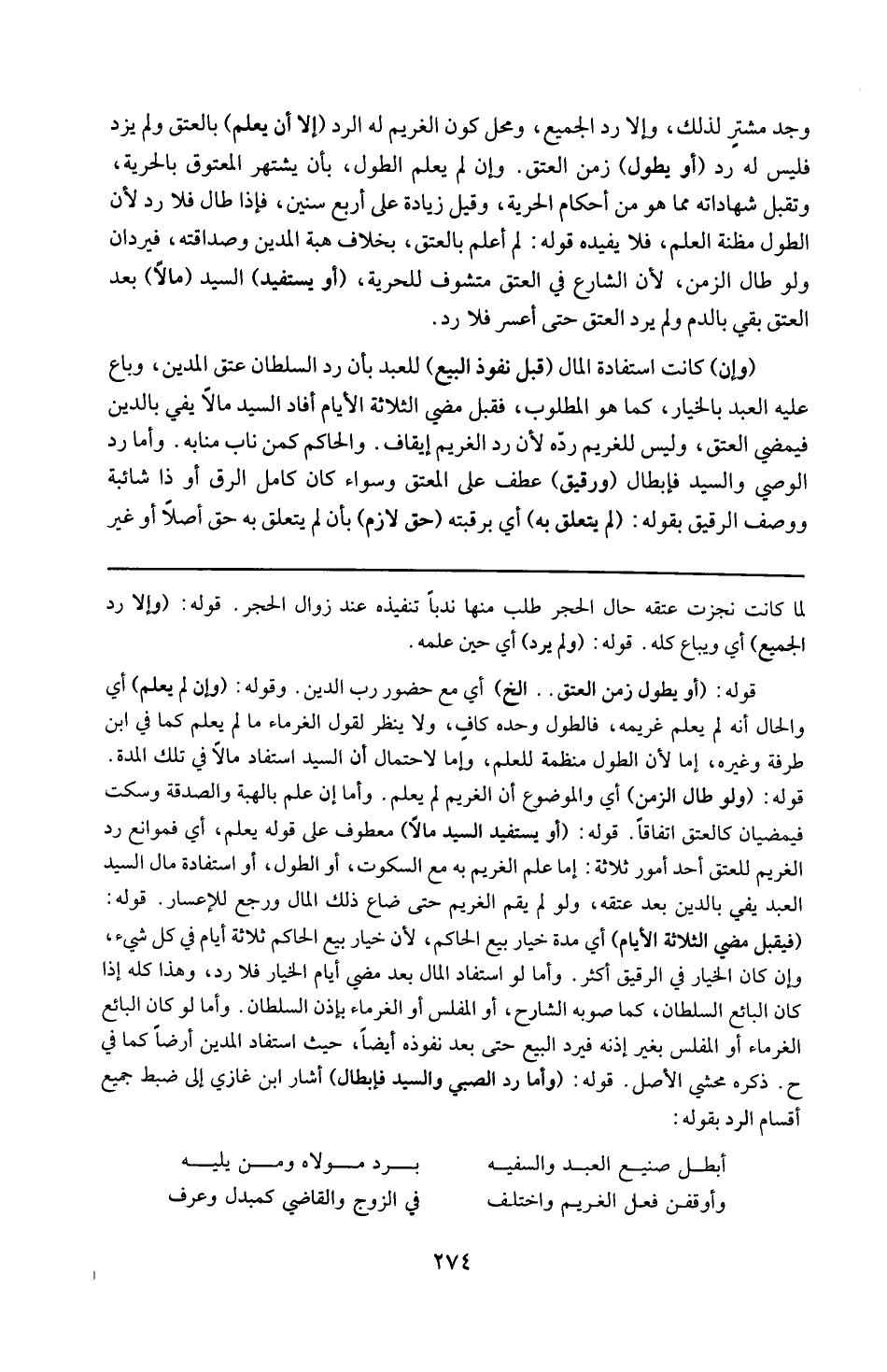 لما كانت نجزت عتقه حال الحجر طلب منها ندباً تنفيذه عند زوال الحجر . قوله : 16 ( وإلا ردّ الجميع ) : أي ويباع كله . قوله : 16 ( ولم يرد ) : أي حين علمه . قوله : 16 ( أو يطول زمن العتق ) إلخ : أي مع حضور رب الدين . قوله : 16 ( وأن لم يعلم ) : أي والحال لم يعلم غريمه فالطول وحده كاف ولا ينظر إلى قول الغرماء ما لم يعلم كما في ابن عرفة وغيره ، إما لأن الطول مظنة للعلم ، وإما لاحتمال أن السيد استفاد مالا في تلك المدة . قوله : 16 ( ولو طال الزمن ) : أي والموضوع أن الغريم لم يعلم ، وأما إن علم بالهبة والصدقة وسكت فيمضيان كالعتق اتفاقاً . قوله : 16 ( أو يستفيد السيد مالا ) : معطوف على قوله يعلم أي فموانع رد استفادة مال للعتق أحد ثلاثة ، إما علم الغريم به مع السكوت ، أو الطول ، أو استفادة مال لسيد العبد يفي بالدين بعد عتقه لو لم يقم الغريم حتى ضاع ذلك المال ورجع للإعسار . قوله : 16 ( فقبل مضي ثلاثة أيام ) : أي مدة خيار بيع الحاكم ، لأن خيار بيع الحاكم ثلاثة أيام في كل شيء وإن كان الخيار في الرقيق أكثر ، وأما لو استفاد المال بعد مضي أيام الخيار فلاط رد وهذا كله إذا كان البائع السلطان كما صوبه الشارح أوالمفلس أو الغرماء بإذن السلطان ، وأما لو كان البائع الغرماء أو المفلس بغير إذنه فيرد البيع حتى بعد أيضا حيث استفاد المدين مالا كما ذكره محشي الأصل . قوله : 16 ( وإما رد الصبي والسيدفإبطال ) : ابن غازي إلى ضبط جميغ أقسام الرد بقوله : أبطل صنيع العبد والسفيه بردّ مولاه ومن يليه وأوقفن فعل الغريم واختلف في الزوج والقاضي كمبدل وعرف