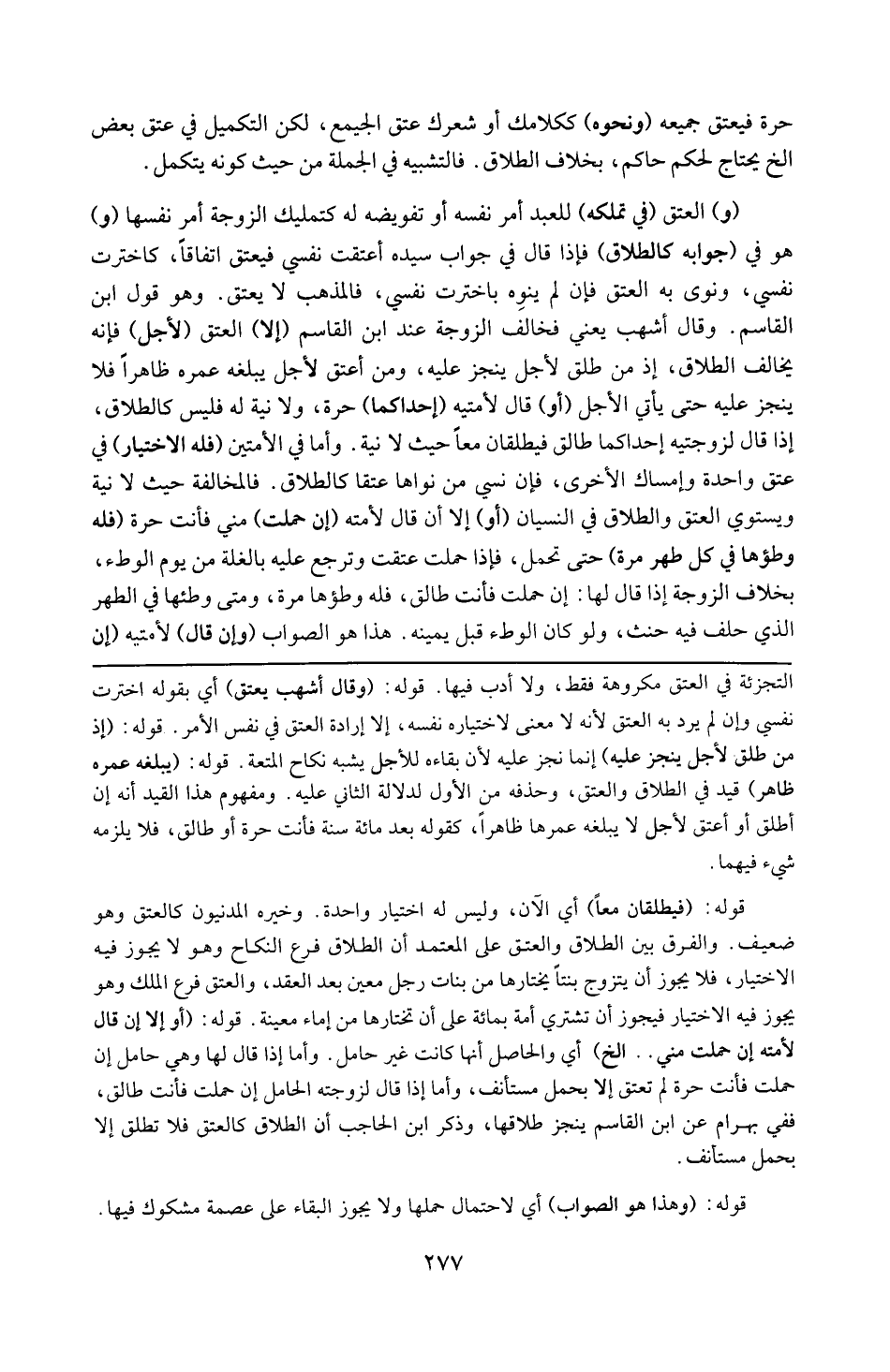 التجزئة في العتق مكروهة فقط ولا أدب فيها . قوله : 16 ( وقال أشهب يعتق ) : أي بقوله اخترت نفسي وإن لم يرد به العتق لأنه لا معنى لاختيار نفسه إلا إرادة العتق في نفس الأمر . قوله : 16 ( إذ من طلق لأجل ينجز عليه ) : أنما نجز عليه لأن بقاءه للأجل يشبه نكاح المتعة . قوله : 16 ( يبلغه عمره ظاهراً ) : قيد في الطلاق وحذفه من الأول لدلالة الثاني عليه ، ومفهوم هذا القيد أنه إن طلق أو أعتق لأجل لايبلغه عمرهما ظاهراً كقوله بعد مائة سنة فأنت حرة أو طالق فلا يلزمه شيء فيهما . قوله : 16 ( فيطلقان معاً ) : أي الآن وليس له اختيار واحدة وخيره المدنيون كالعتق وهو ضعيف والفرق بين الطلاق والعتق على المعتمد أن الطلاق فرع النكاح وهو لايجوز فيه الاختيار فلا يجوز أن يتزوج بنتاً يختارها من بنات رجل معين بعد العقد ، والعتق فرع الملك وهو يجوز فيه الاختيار فيجوز أن تشتري أمة بمائة على أن تختارها من إما أن تختارها من إما معينة . قوله : 16 ( أو إلا قال لأمته إن حملت مني ) إلخ : أي والحال أنها كانت غير حامل وأما إذا قال لها وهي حامل إن حملت فأنت حرة لم تعتق إلا بحمل مستألف ، وأماإذا قال لزوجته الحامل إن حملت فأنت طالق ففي بهرام عن ابن القاسم ينجز طلاقها وذكر ابن الحاجب أن الطلاق كالعتق فلا تطلق إلا بحمل مستأنف . قوله : 16 ( هذا هو الصواب ) : أي لاحتمال حملها ولا يجوز البقاء على عصمة مشكوك فيها . قوله : 16 ( هذا هو الصواب ) : أي لاحتمال حملهاولا يجوز البقاء على عصمة مشكوك فيها . )