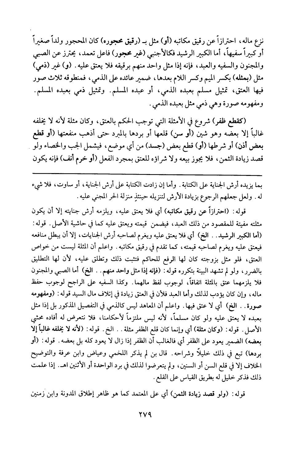 بما يزيده أرش الجناية على الكتابة ، وأما إن زادت الكتابة على أرش الجناية ، أو ساوت ، فلا شيء له . ولعل جعلهم الرجوع بزيادة الأرش لتنزيله حينئذ منزلة الحر المجني عليه . قوله : ( احتراز عن رقيق مكاتبة ) أي فلا يعتق عليه ، ويلزمه أرش جنايته إلا أن يكون مثلته مفيتة للمقصود من ذلك العبد ، فيضمن قيمته ويعتق عليه كما في حاشية الأصل . قوله ( أما الكبير الرشيد . ألخ ) أي فلا يعتق عليه ويغرم لصاحبه أرش الجنايات ، إلا أن يبطل منافعه فيعتق عليه ويغرم لصاحبه قيمته ، كما تقدم في رقيق مكاتبة . واعلم أن المثلثة ليست من خواص العتق ، فلو مثل بزوجته كان لها الرفع للحاكم فتثبت ذلك وتطلق عليه ، لأن لها التطليق بالضرر ، ولو لم يشهد البينة بتكرره قوله : ( فإنه إذا مثل واحد منهم ألخ ) أما الصبي والمجنون فلا يلزمها عتق بالمثلة اتفاقاً ، لوجوب لفظ مالهما . وكذا السفيه على الراجح لوجوب حفظ ماله ، وإن كان يؤدب لذلك وأما العبد فلأن في العتق زيادة في إتلاف مال السيد قوله : ( ومفهومه صورة . . . إلخ ) أي لا عتق فيها . واعلم أن المعاهد ليس كالذمي في التفصيل المذكور بل إذا مثل بعبده لا يعتق عليه ولو كان مسلماً ، لأنه ليس ملتزماً لأحكامنا ، فلا نتعرض له أفاده محشي الأصل . قوله : ( وكان مثلة ) أي وإنما فالغالب أن الظفر إذا زال لا يعود كله بل بعضه . قوله : ( أو بردها ) تبع في ذلك خليلاً وشراحه . قال بن لم يذكر اللخمي وعياض وابن عرفة والتوضيح الخلاف إلا في قلع السن أو السنين ، ولم يتعرضوا لذلك في برد الواحدة أو الاثنين 1 هـ . إذا علمت ذلك فذكر خليل له بطريق القياس على القلع . قوله . ) ولو قصد زيادة الثمن ) أي على المعتمد كما هو ظاهر إطلاق المدونة وابن زمنين .
