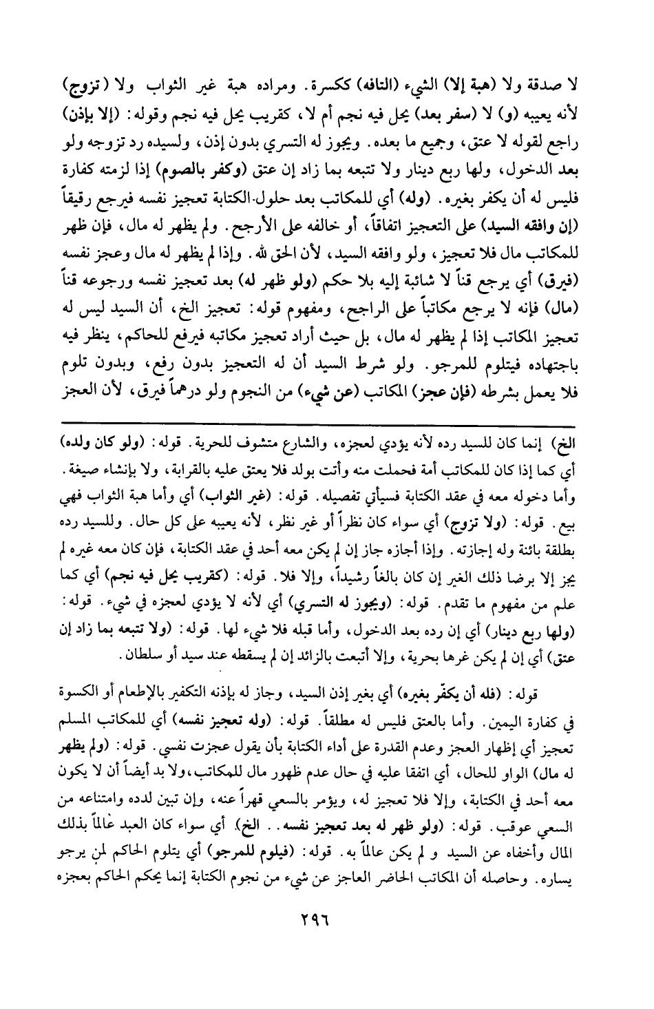 قوله : 16 ( ولا تزوج ) : أي سواء كان نظراً أو غير نظر لأنه يعيبه على كل حال وللسيد رده بطلقة بائنة وله إجازته و إذا أجازه جاز إن لم يكن معه أحد في عقد الكتابة ، فإن كان معه غيره لم يجز إلا برضا ذلك الغير إن كان بالغاً رشيداً وإلا فلا .