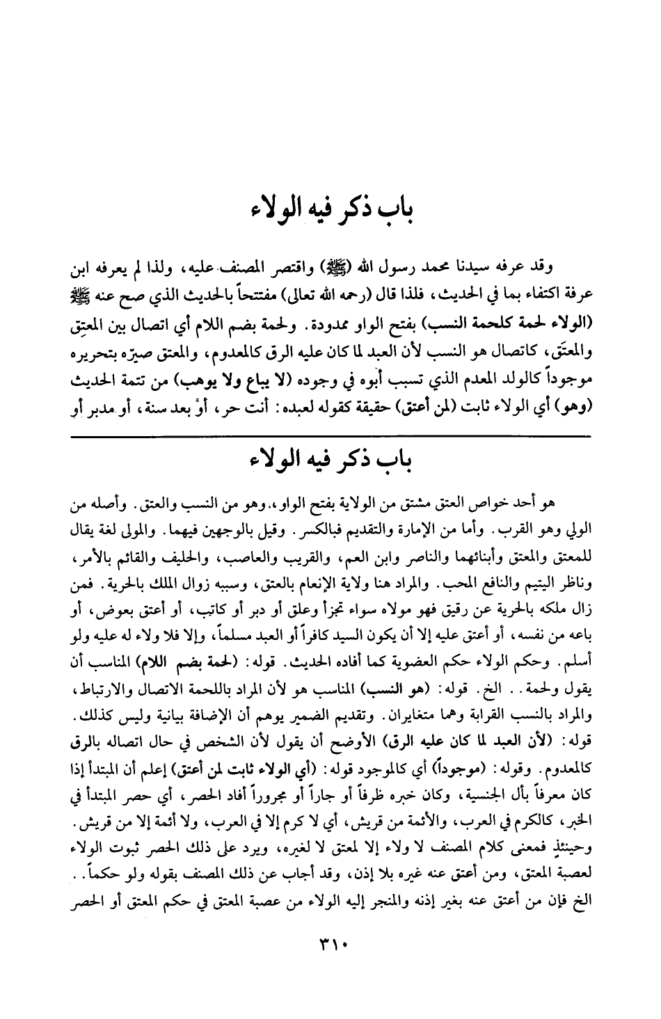 هو أحد خواص العتق مشتق من الولاية بفتح الواو وهو من النسب والعتق وأصله من الولي وهو القرب ، وأما من الإمارة و التقديم فبالكسر وقيل بالوجهين فيهما والمولى لغة يقال للمعتق والمعتق وأبنائهما والناصر وابن العم والقريب والعاصب والحليف والقائم بالأمر و ناظر اليتيم والنافع المحب والمراد به هنا ولاية الإنعام بالعتق وسببه زوال الملك بالحرية ، فمن زال ملكه بالحرية عن رقيق فهو مولاه سواء نجز أو علق أو دبر أو كاتب أو أعتق بعوض أو باعة من نفسه أو أعتق عليه ، إلا أن يكون السيد كافراً والعبد مسلماً وإلا فلا ولاء له عليه ، ولو أسلم وحكم الولاء حكم العصوبة كما أفاده الحديث .