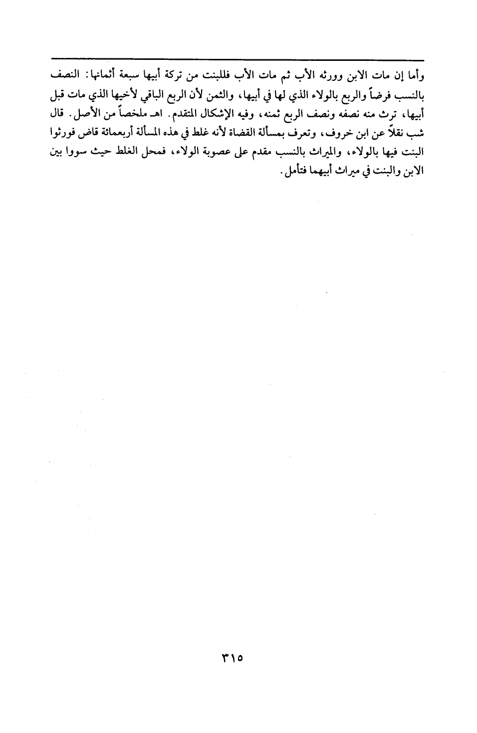 و أما إن مات ابن و ورثه الأب ثم مات الأب فللبنت من تركة أبيها سبعة أثمانها النصف بالنسب فرضاً و الربع بالولاء الذي لها في أبيها و الثمن لأن الربع الباقي لأخيها الذي مات قبل أبيها ترث منه نصفه و نصف الربع ثمنه و فيه الإشكال المتقدم 19 ( اه ملخصاً من الأصل ) . قال 19 ( شب ) نقلا عن ابن خروف : و تعرف بمسألة القضاة لأنه غلط في هذه المسألة أربعمائة قاض فورّثوا البنت فيها بالولاء و الميراث بالنسب مقدم على عصوبة الولاء فمحل الغلط حيث سووا الابن و البنت في ميراث أبيهما فتأمل .