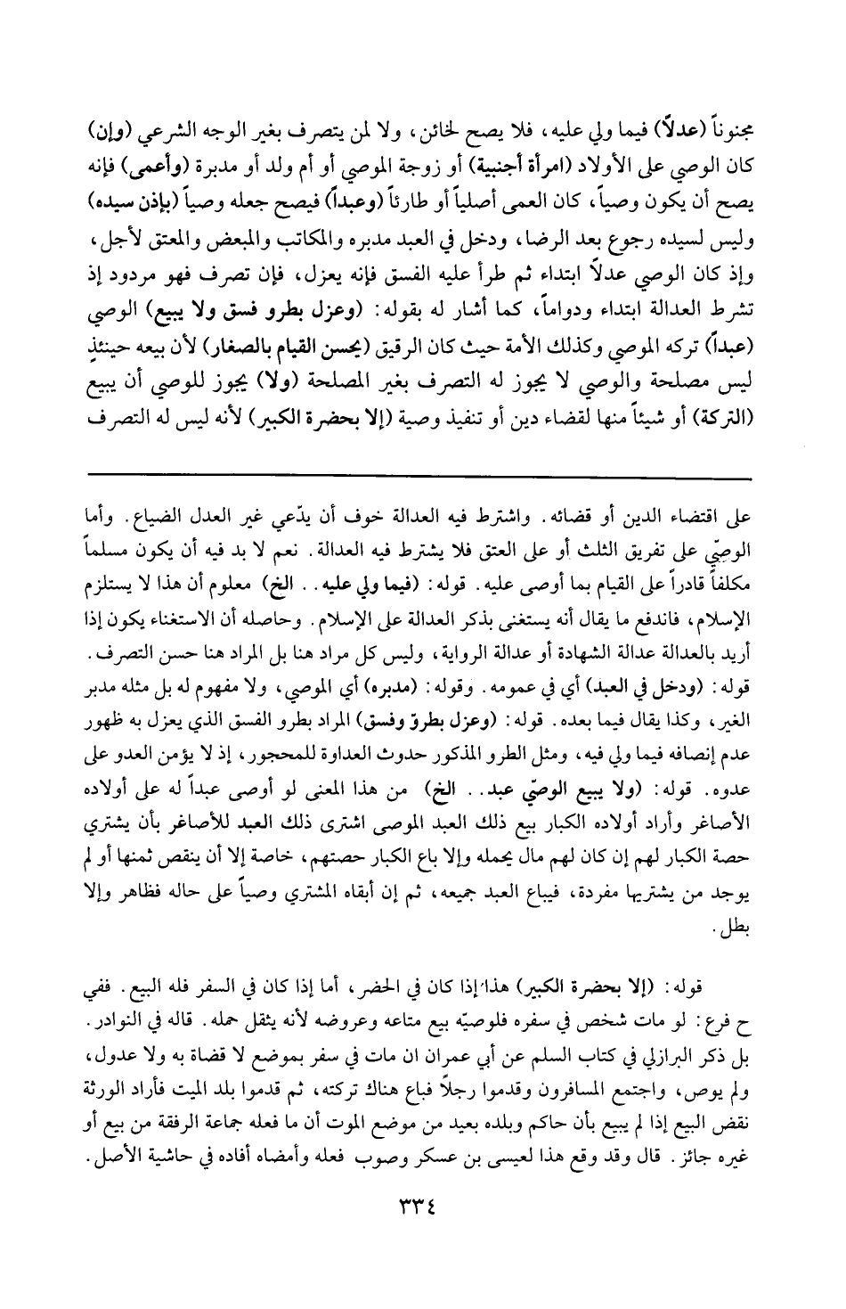 قوله : 16 ( و لايبيع الوصي عبداً ) إلخ : من هذا المعنى لو أوصى عبداً له على أولاده الأصاغر و أراد أولاده الكبار بيع دلك العبد الموصي اشترى ذلك العبد للأصاغر بأن يشتري حصة الكبار لهم إن كان لهم مال يحمله و إلا باع الكبار حصتهم خاصة إلا إن ينقض ثمنها أو لم يوجد من يشتريها مفردة فيباع العبد جميعه ، ثم إن أبقاه المشتري وصيّاً على حاله فظاهره و إلا بطل .