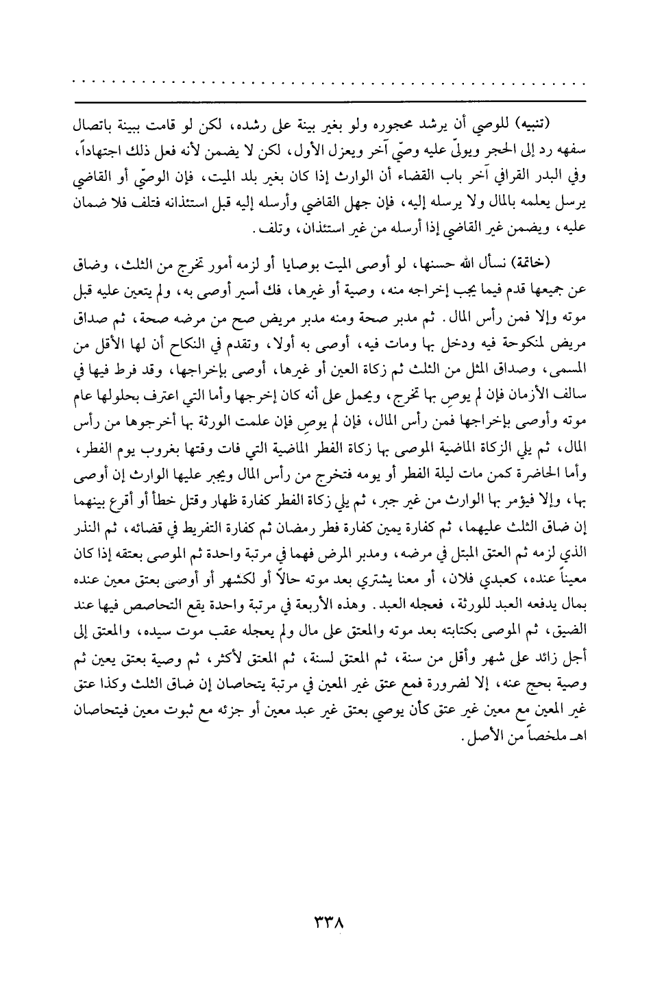 خاتمة : نسأل الله حسنها لو أوصى الميت بوصايا أو لزمه أمور تخرج من الثلث وضاق عن جميعها قدم في مايجب إخراجه منه وصية أو غيرها فك أسير أوصى به ولم يتعين عليه قبل موته وإلا فمن رأس المال ، ثم مدبر صحته و منه مدبر مريض صح من مرضه صحة بينة ، ثم صداق مريض لمنكوحة فيه ودخل بها ومات فيه أوصى به أو لا ، وتقدم في النكاح أن لها الأقل من المسمى و صداق المثل من الثلث ، ثم زكاة العين أو غيرها أوصى بإخراجها وقد فرط فيها في سالف الأزمان ، فإن لم يوص بها تخرج ويحمل على أنه كان أخرجها . و أما التي اعترف بحلولها عام موته و أوصى بإخراجها فمن رأس المال ، فإن لم يوص فإن علمت الورثة بها أخرجوها برأس المال ثم يلي الزكاة الماضية الموصى بها زكاة الفطر الماضية التي فات مقتها بغروب يوم الفطر . وأما الحاضرة كأن مات ليلة الفطر أو يومه فتخرج من رأس المال و يجبر عليه الوارث إن أوصى به و إلا يؤمر بها الوارث من غير جبر ، ثم يلي زكاة الفطر كفارة ظهار وقتل خطأ أو أقرع بينهما إن ضاق الثلث عليهما ، ثم كفارة يمين ، ثم كفارة فطر رمضان ، ثم كفارة التفريط في قضائه ، ثم النذر الذي لزمه ، ثم العتق المبتل في مرضه و مدبر المرض فهما قي مرتبة واحدة ثم الموصى بعتقه إذا كان معيناً عنده كعبد فلان أو معيناً يشتري بعد موته حالا أو لكشهر أو أوصى بعتق معين عنده بمال يدفه العبد للورثة فعجله العبد وهذه الأربعة في مرتبة واحدة يقع التحاصص فيها عند الضيق ثم الموصي بكتابته بعد موته ، و المعتق على مال و لم يعجله عقب موت سيده و المعتق إلى أجل زائد على شهر و أقل من سنة ، ثم المعتق لسنة ثم المعتق لأكثر ، ثم وصية بعتق لم يعين ثم وصية بحج عنه إلا لضرورة ، فمن عتق غير المعين في مرتبة يتحاصان إن ضاق الثلث ، و كذا عتق غير المعين مع معين غير عتق كأن يوصى بعتق غير عبد معين أو جزئه مع ثبوت معين فيتحاصان 19 ( اه ملخصاً من الأصل ) .
