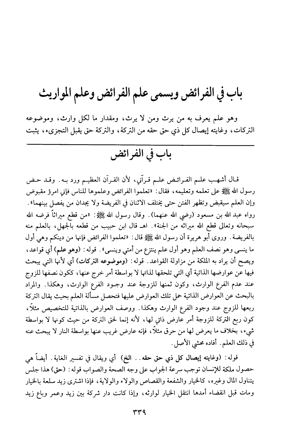 قال شب : علم الفرائض علم قرآني لأن القرآن العظيم ورد به وقد حض رسول الله على تعلمه وتعليمه فقال : ( تعلموا الفرائض وعلموها الناس فإني امرؤ مقبوض وإن العلم سيقبض وتظهر الفتن حتى يختلف الاثنان في الفريضة ولا يجدان من يفضل بينهما ) رواه عبد الله بن مسعود رضي الله عنهما ، وقال رسول الله : ( من قطع ميراثاً فرضه الله سبحانه وتعالى قطع الله ميراثه من الجنة ) ( اه ابن حبيب ) معنى قطعه بالجهل بالعلم منه بالفريضة ، وروى أبو هريرة أن رسول الله قال : ( تعلموا الفرائض فإنها من دينكم وهي أول ما ينسى وهو نصف العلم وهو أول علم ينزع من أمتي وينسى ) .