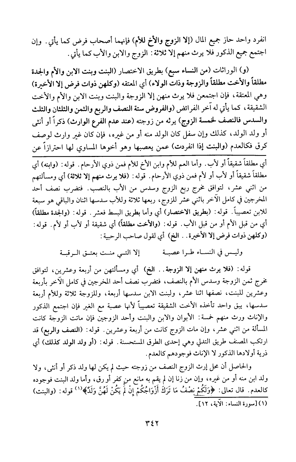 والحاصل أن محل إرث الزوج النصف من زوجته حيث لم يكن ولد ذكر أو أنثى ولا ولد ابن منه أو من غيره وإن من زناً إن لم يقم به مانع كن كفر أو رق وأما ولد البنت فوجوده كالعدم قال تعالى : { وَلَكُمْ نِصْفُ مَا تَرَكَ أزْوَاجُكُمْ إنْ لَمْ يَكُنْ لهُنَّ وَلَدٌ } .
