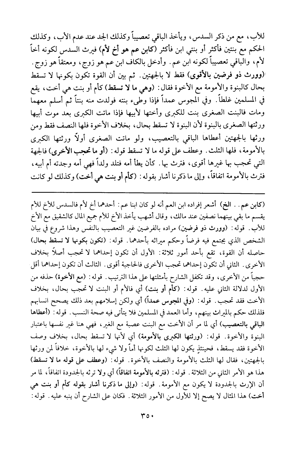 قوله : ( تكون بكونها لا تسقط بحال ) : حاصله أن القوة تقع بأحد أمور ثلاثة : الأول أن تكون إحدادهما لا تحجب أصلاً بخلاف الأخرى ، الثاني أن تكون إحداهما تحجب الأخرى فالحاجبة أقوى ، الثالث أن تكون إحداهما أقل حجباً من الأخرى وقد تكفل الشارح بأمثلتها على هذا الترتيب .