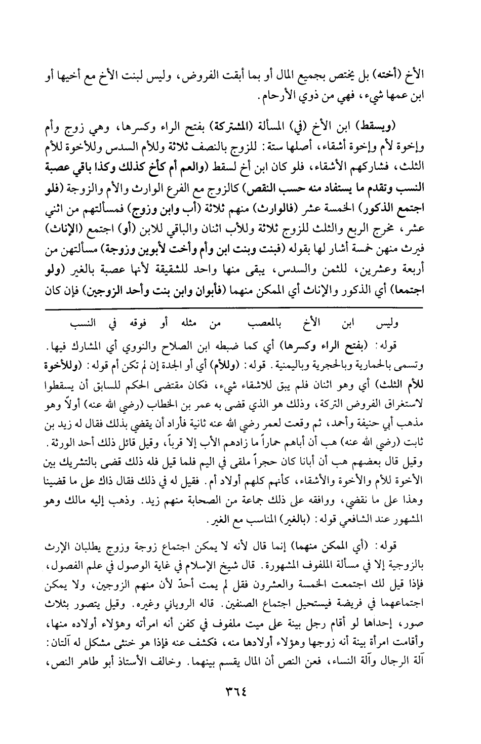 قوله : ( وللإخوة للأم الثلث ) : أي وهو اثنان فلم يبق للأشقاء شيء فكان مقتضى الحكم السابق أن يسقطوا لاستغراق الفروض التركة وذلك هو الذي قضى به عمر بن الخطاب رضي الله عنه أوّلا وهو مذهب أبي حنيفة وأحمد ، ثم وقعت لعمر رضي الله عنه ثانية فأراد أن يقضي بذلك فقال له زيد بن ثابت رضي الله عنه : هب أن أباهم حمار ما زادهم الأب إلا قرباً ، وقيل قائل ذلك أحد الورثة وقيل قال بعضهم هب أن أبانا كان حجراً ملقى في اليم فلما قيل له ذلك قضى بالتشريك بين الإخوة للأم والإخوة الأشقاء كأنهم كلهم أولاد أم . فقيل له في ذلك فقال : ذاك على ما قضينا وهذا على ما نقضي ووافقه على ذلك جماعة من الصحابة منهم زيد وذهب إليه مالك وهو المشهور عند الشافعي .