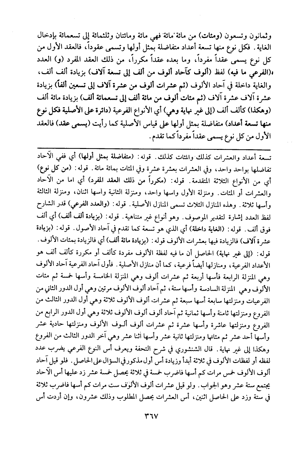قوله : ( إلى غير نهاية ) : الحاصل أن ما فيه لفظة الألوف مفردة كألف أو مكررة كألف ألف هو الأعداد الفرعية ومنازلها أيضاً فرعية ، كما أن منازل أصلية فأول آحاد الفرعية آحاد الألوف وهي المنزلة الرابعة فأسها أربعة ، ثم عشرات ألوف وهي المنزلة الخامسة وأسها خمسة ثم مئات الألوف وهي المنزلة السادسة وأسها ستة ، ثم آحاد ألوف الألوف مرتين وهي أول الدور الثاني من الفرعيات ومنزلتها سابعة وأسها سبعة ، ثم عشرات ألوف الألوف ومنزلتها ثامنة وأسها ثمانية ، ثم مئات الألوف ومنزلتها تاسعة وأسها تسعة ، ثم آحاد ألوف ألوف الألوف ثلاثة وهي أول الدور الثالث من الفروع ومنزلتها عاشرة وأسها عشرة ، ثم عشرات ألوف الألوف ومنزلتها حادية عشر وأسها أحد عشر ، ثم مئاتها ومنزلتها ثانية عشر وأسها اثنا عشر ، وهي آخر الدور الثالث من الفروع وهكذا إلى غير نهاية .