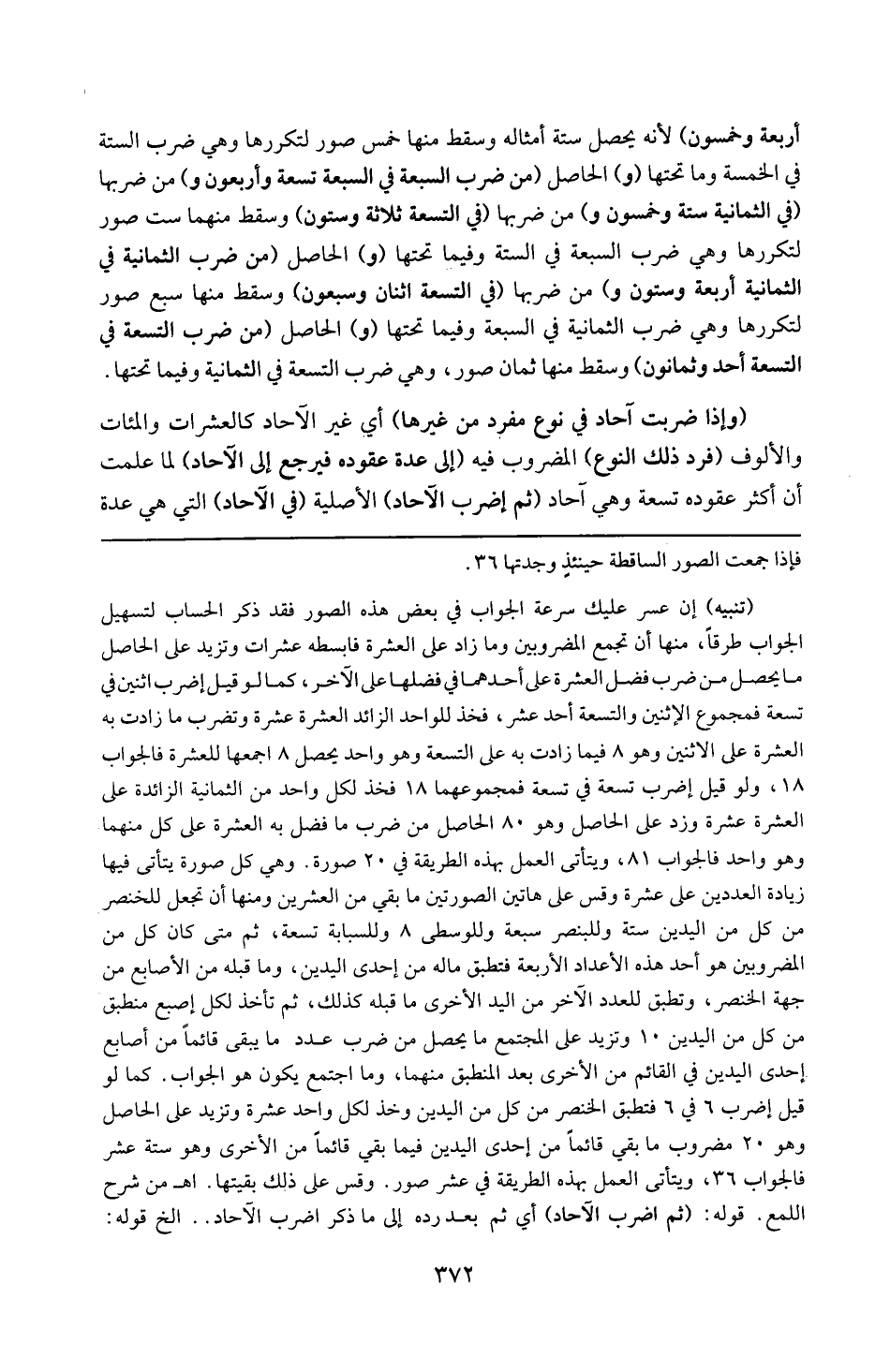 تنبيه : إن عسر عليك سرعة الجواب في بعض هذه الصور فقد ذكر الحساب لتسهيل الجواب طُرُقاً منها أن تجمع المضروبين وما زاد على العشرة فابسطه عشرات وتزيد على الحاصل ما يحصل من ضرب فضل العشرة على أحدهما في فضلها على الآخر ، كما لو قيل اضرب اثنين في تسعة فمجموع الاثنين والتسعة أحد عشر ، فخذ للواحد الزائد على العشرة عشرة وتضرب ما زادت به العشرة على الاثنين وهو ثمانية فيما زادت به على التسعة وهو واحد يحصل ثمانية أجمعها للعشرة فالجواب ثمانية عشر ، ولو قيل اضرب تسعة في تسعة فمجموعهما ثمانية عشر فخذ لكل واحد من الثمانية الزائدة على العشرة عشرة وزد على الحاصل وهو ثمانون الحاصل من ضرب ما فضل به العشرة على كل منهما وهو واحد ، فالجواب أحد وثمانون ، ويتأتى العمل بهذه الطريقة في عشرين صورة وهي كل صورة يتأتى فيها زيادة العددين على عشرة وقس على هاتين الصورتين ما بقى من العشرين ، ومنها أن تجعل للخنصر من كل من اليدين ستة وللبنصر سبعة وللوسطى ثمانية وللسبابة تسعة ثم متى كان كل من المضروبين هو أحد هذه الأعداد الأربعة فتطبق ماله من إحدى اليدين وما قبله من الأصابع من جهة الخنصر ، وتطبق للعدد الآخر من اليد الأخرى مع ما قبله كذلك ثم تأخذ لكل أصبع منطبق من كل من اليدين عشرة وتزيد على المجتمع ما يحصل من ضرب عدة ما يبقى قائماً من أصابع إحدى اليدين في القائم من الأخرى بعد المنطبق منهما ، وما اجتمع يكون هو الجواب كما لو قيل اضرب ستة في ستة فتطبق الخنصر من كل من اليدين وخذ لكل واحد عشرة وتزيد على الحاصل وهو عشرون مضروب ما بقى قائماً من إحدى اليدين فيما بقى قائماً من الأخرى وهو ستة عشر فالجواب ستة وثلاثون ، ويتأتى العمل بهذه الطريقة في عشر صور وقس على ذلك بقيتها ( اه من شرح اللمع ) .