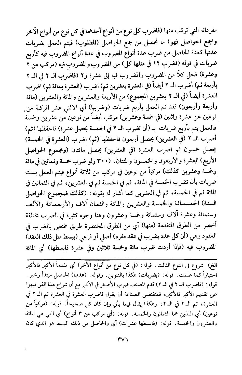 قوله : ( فاضرب الاثنين في الاثنين ) : قدم المصنف ضرب الأصغر قبل الأكبر مع أن شراح هذا الفن نبهوا على تقديم الأكبر فالأكبر فمقتضى الصناعة أن يقول فاضرب العشرة في العشرة ثم الاثنين في العشرة ، ثم الاثنين في الاثنين وهكذا يقال فيما يأتي وإن كان كل صحيحاً .