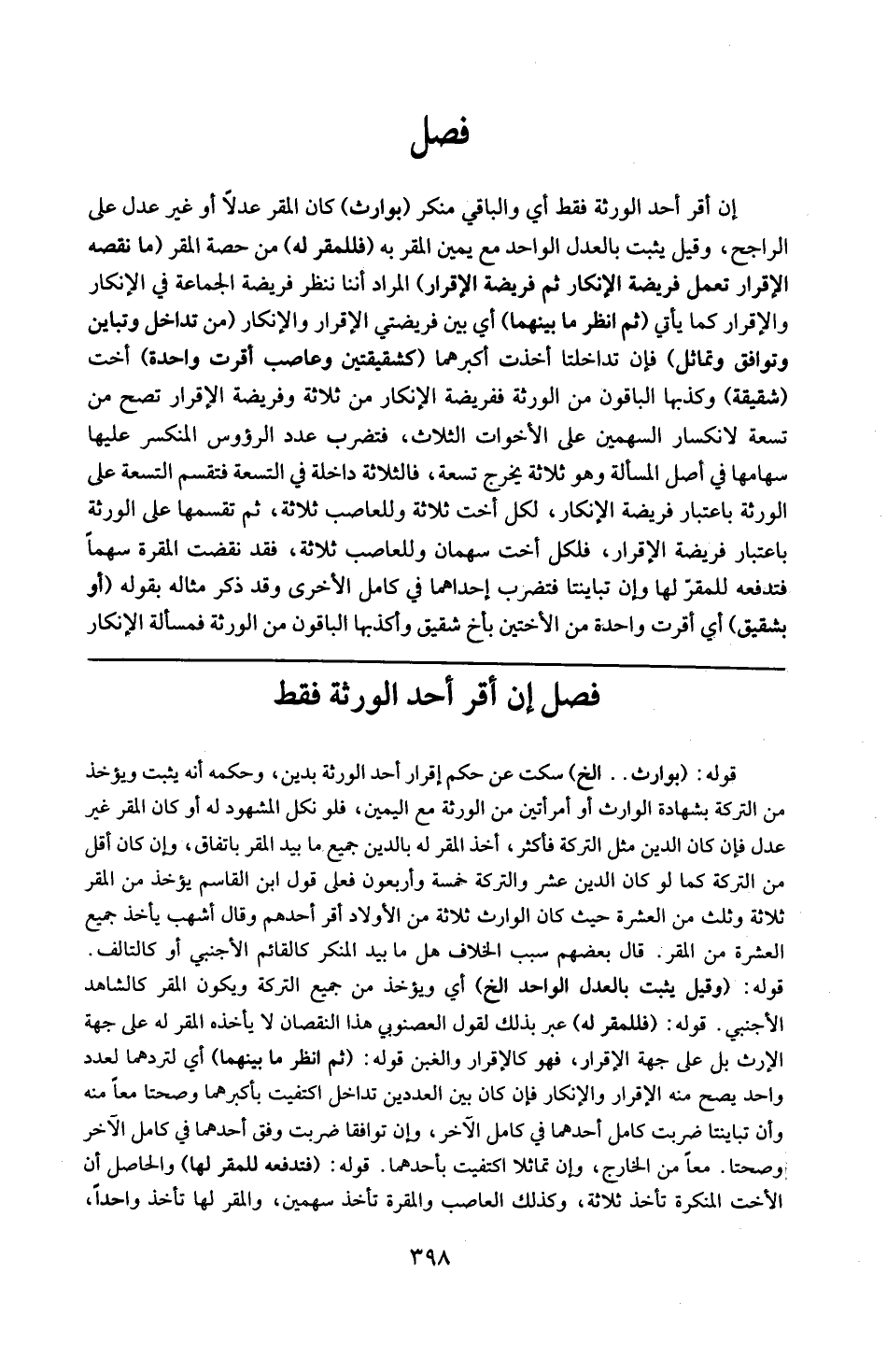 قوله : 16 ( بوارث ) إلخ : سكت عن حكم إقرار أحد الورثة بدين وحكمه أنه يثبت ويؤخذ من التركة بشهادة الوارث أو امرأتين من الورثة مع اليمين ، فلو نكل المشهود له أو كان المقر غير عدل فإن كان الدين مثل التركة فأكثر أخذ المقر له بالدين جميع ما بيد المقر باتفاق ، وإن كان أقل من التركة كما لو كان الدين عشرة والتركة خمسة وأربعون فعلى قول ابن القاسم يؤخذ من المقر ثلاثة وثلث من العشرة حيث كان الوارث ثلاثة من الأولاد أقر أحدهم . وقال أشهب : يأخذ جميع العشرة من المقر قال بعضهم سبب الخلاف هل مابيد المنكر كالقائم الأجنبي أو كالتالف . قوله : 16 ( وقيل يثبت بالعدل الواحد ) : إلخ أي ويؤخذ من جميع التركة ويكون المقر كالشاهد الأجنبي . قوله : 16 ( فللمقرر ) : عبر بذلك لقول العصنوني هذا النقصان لايأخذه المقر له على جهة الإرث ، بل على جهة الإقرار بالدين . قوله : 16 ( ثم انظر ما بينهما ) : أي لتردهما بعدد واحد يصح منه الإقرار والإنكار ، فإن كان بين العددين تداخل اكتفيت بأكبرهما وصحة معا منه ، وإن تباينتا ضربت كامل أحدهما في كامل الآخر ، وإن توافقا ضربت وفق أحدهما في كامل الآخر وصحتا معا من الخارج ، وإن تماثلا اكتفيت بأحدهما : قوله : 16 ( فتدفعه للمقر لها ) : الحاصل أن الأخت المنكرة تأخذ ثلاثة وكذلك العاصب والمقرة تأخذ سهمين والمقرلها تأخذ واحدا