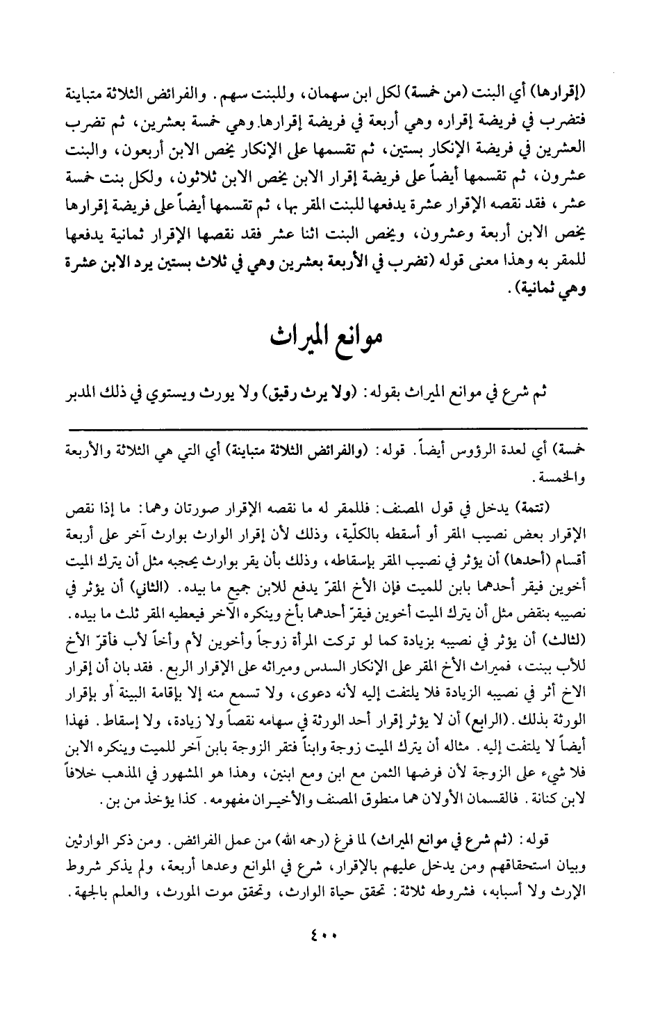 ( فصل ) قوله : 6 ( ثم شرع في موانع الميراث ) : لما فرغ من رحمه الله من عمل الفرائض ومن ذكر الوارثين وبيان استحقاقهم ومن يدخل عليهم بالإقرار شرع في الموانع وعدها أربعة ، ولم يذكر شروط الإرث ولا اسبابه فشروطه ثلاثة : تحقق حياة الوارث وتحقق موت المورث والعلم بالجهة