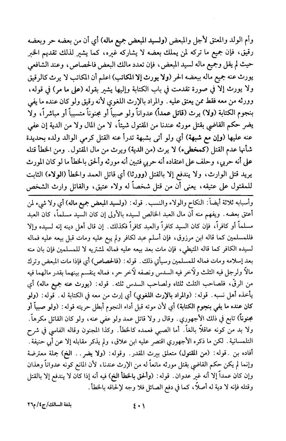 وأسبابه ثلاثة أيضا : النكاح والولاء والنسب . قوله : 16 ( ولسيد المبغض جميع ماله ) : أي ولاشىء لمن أعتق بغضه ويفهم منه أن مال القن الخالص لسيده بالأولى إن كان السيد مسلما كان العبد كافرا فكذلك إن قال أهل دينه إنه لسيده وإلا فللمسلمين كما قاله ابن مرزوق . فإن اسلم عبد لكافر ولم يبن عليه ومات قبل بيعه عليه فماله لسيده الكافر كما قاله المتيطى ، فإن مات بعد بيعه عليه فماله لمشتريه لا للمسلمين ، فإن بان منه بعد اسلامه ومات فماله للمسلمين سيأتي ذلك . قوله : 16 ( فالحصاص ) : أي فإذا مات المبغض وترك مالا ولرجل فيه الثلث ولآخر فيه السدس ونصفه الآخر حر فماله ينقسم بينهما بقدر مالهما فيه من الرق فلصاحب الثلث ثلثاه ولصاحب السدس ثلثه . قوله : 16 ( يورث عنه جميع ماله ) : أي يأخذه أهل نسبه . قوله : 16 ( والمراد بالإرث اللغوي ) : أي إرث من معه في الكتابة له . قوله : 16 ( ولو كان عنده مايفي بنجوم الكتابة ) : أي لأن موته قبل أداء النجوم أبطل حريته . قوله : 16 ( ولو صبيا أو مجنونا ) : تبع في ذلك الأجهورى وقال : ولا قاتل عمد ولو عفى عنه ولو كان القاتل مكرها ، ولابد من كونه عاقلا بالغا ، أما الصبي فعمده كالخطأ وكذا المجنون وقاله الفاسي في شرح التلمسانية لكن ما ذكره الأجهوري اقتصر عليه ابن علاق ولم يذكر مقابله إلا عن أبي حنيفة أفاده ( بن ) . قوله : 16 ( من المقتول ) : متعلق بيرث المقدر . وقوله : 16 ( ولا يضر ) إلخ جملة معترضة ، وإنما لم يكن حكم القاضي بقتل مورثه مانعا له من الإرث عندنا ، لأن المانع كونه عدوانا وهذا وإن كان عمدا إلا أنه غير عدوان . قوله : 16 ( وألحق بالخطأ ) ألخ : فيه أنه إذا كان لا يندفع إلا بالقتل وقتله فإنه لا دية له أصلا كما في دفع الصائل فلا وجه لإلحاقه بالخطأ .