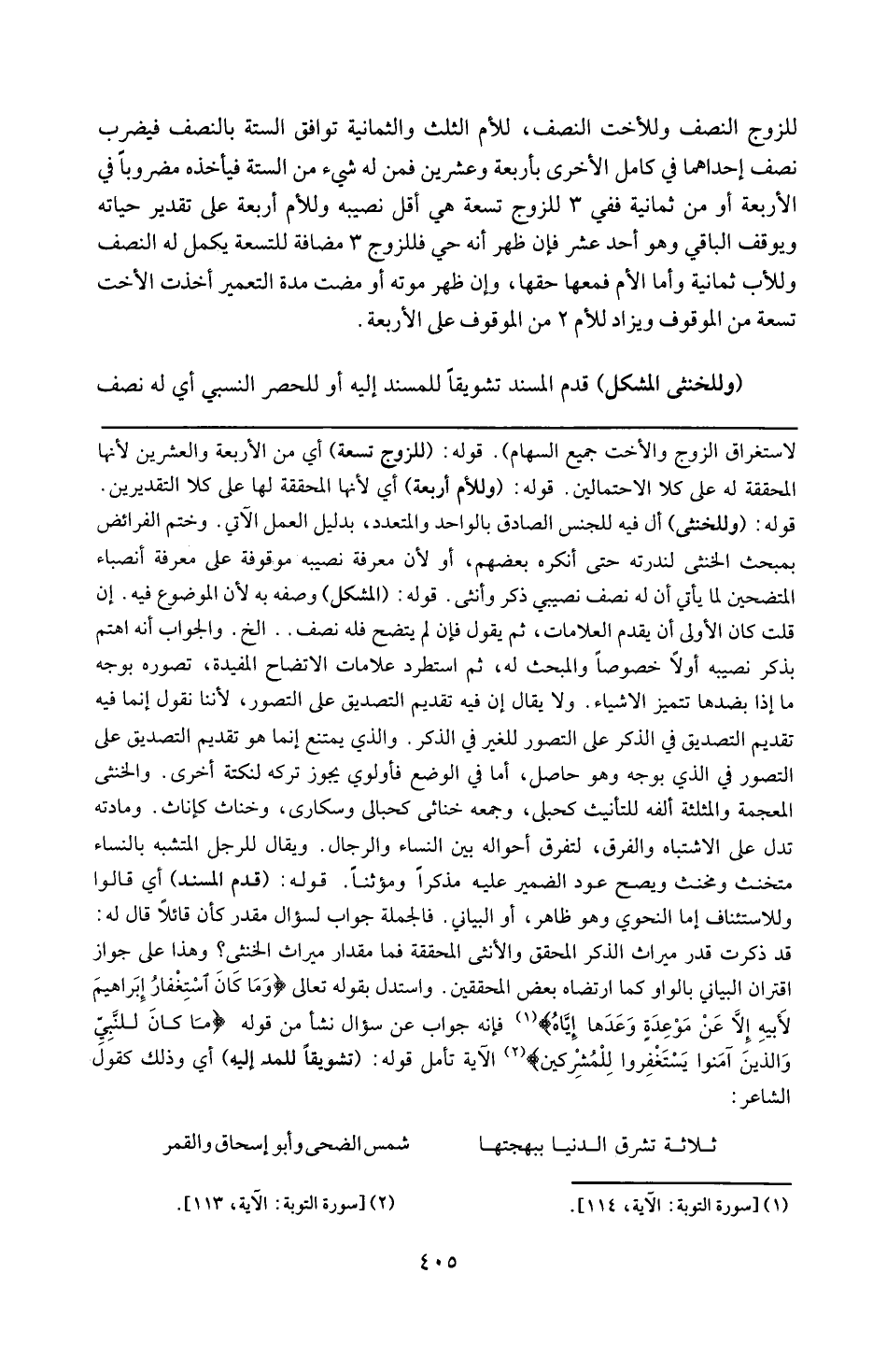 لاستغراق الزوج والأخت جميع السهام . قوله 19 ( للزوج تسعة ) : أي من الأربعة والعشرين ، لأنها المحققة له على كلا الإحتمالين . قوله : 19 ( وللأم أربعة ) : أي أنها المحققة لها على كلا التقديرين . قوله : 16 ( وللخنثى ) : أل فيه للجنس الصادق بالواحد والمتعدد بدليل العمل الآتي وختم الفرائض بمبحث الخنثى لندرته حتى أنكره بعضهم أو لأن معرفة نصيبه موقوفة على معرفة أنصباء المتضحين لما يأتي أن له نصف نصيبى ذكر وأنثى . قوطه : 16 ( المشكل ) : وصفه به لأن الموضوع فيه . إن قلت كان الأولى أن يقدم العلامات ثم يقول فإن لم يتضح فله نصف إلخ . والجواب أنه اهتم بذكر نصيبه أولا خصوصا والمبحث له ثم استطرد علامات الاتضاح المفيدة تصوره بوجه ما . إذ بضدها تتميز الأشياء . ولا يقال إن فيه تقديم التصديق على التصور لأننا نقول إنما فيه تقديم التصديق في الذكر على التصور للغير في الذكر ، والذي يمتنع إنما هو تقديم التصديطق على التصور في الذهن بوجه ما وهو الحاصل ، أمافي الوضع فأولوى يجوز تركه لنكتة أخرى ، والخنثى بالمعجمى والمثلثة ألفه للتأنيث كحبلى وجمعه خناثى كحبالى وسكارى وخناث كإناث ومادته تدل على الإشتباه والتفرق لتفرق أحواله بين النساء والرجال . ويقال للرجل المتشبه بالنساء متخنث ومخنث ويصح عود الضمير عليه مذكرا ومؤنثا . قوله : 16 ( قدم المسند ) : أي قالوا وللاستئناف إما النحوى وهو ظاهر أو البيانى فالجملة جواب لسؤال مقدر كأن قائلا قال له : قد ذكرت قدر ميراث الذكر المحقق والأنثى المحققة ، فما مقدار ميراث الخنثى ؟ وهذا على جواز إقتران البيانى بالواو كما ارتضاه بعض المحققين واستدل بقوله تعالى : { ومَاَ كَانَ اسْتغْفَارُ إبْراهِيمَ للأبيِه إلاَّ عَنْ مَوعِدَةٍ وَعَدَهَاإيَّاه } فإنها جواب عن سؤال نشأ من قوله قبلَ : { مِا كَانَ للنَّبىّ وَ اللَّذيِنَ امَنْوُا أن يسْتغفروُا للِمُشْرِكِيِن } الآية تأمل . قوله : 16 ( تشويقا للمسند إليه ) : أي وذلك كقول الشاعر : (