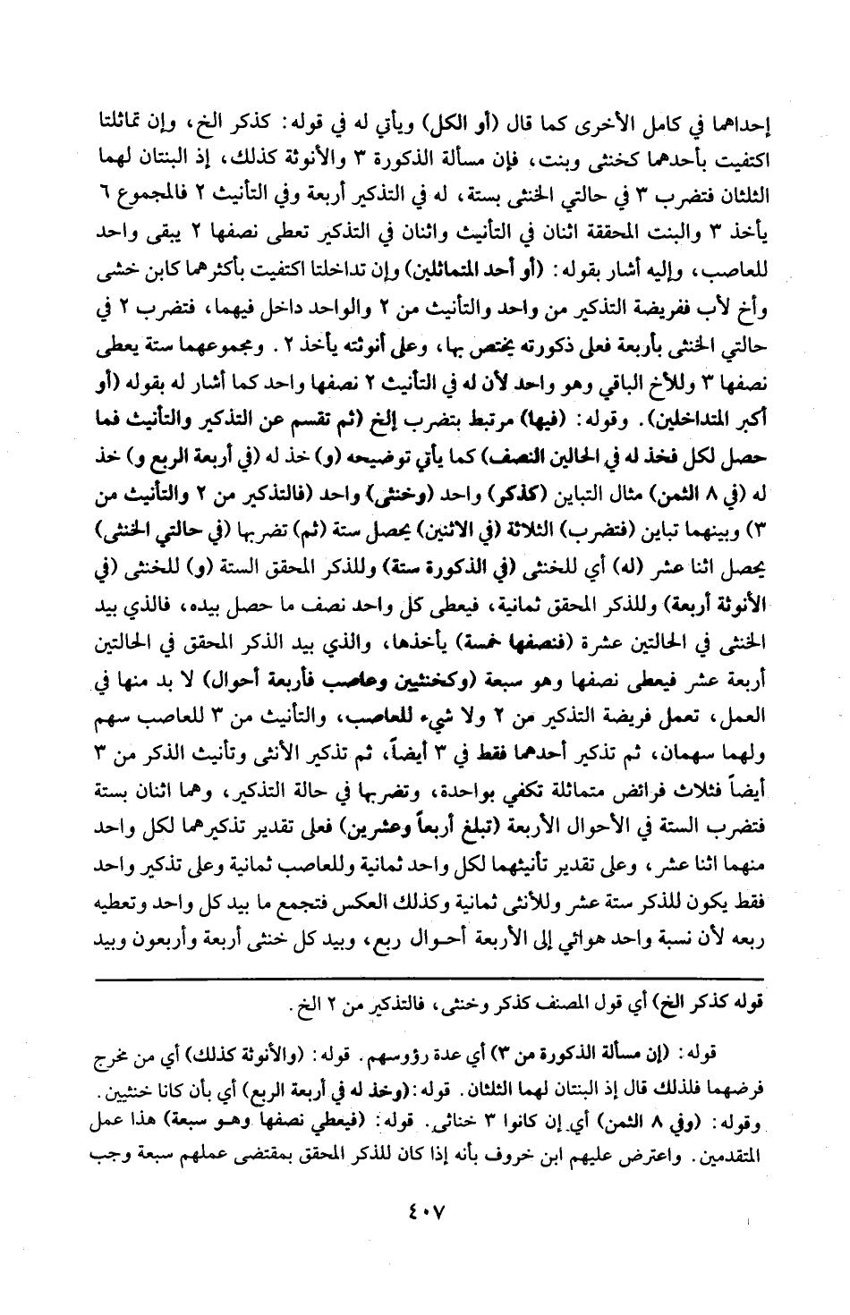 قوله كذكر ) إلخ : أي قول المصنف كذكر وخنثى ، فالتذكير من اثنين إلخ . قوله : 6 ( والأنوثة كذلك ) : أي من مخرج قرضهما فلذلك قال أذ البنتان لهما الثلثان . قوله : 6 ( وخذ له في أربعة الربع ) : أي بأن كانا خنثيين . وقوله : 6 ( وفي ثمانية الثمن ) : أي إن كانوا ثلاثة خناثى . قوله : 6 ( فيعطى نصفها وهو سبعة ) : هذا عمل المتقدمين ، واعترض عليهم ابن خروف بأنه إذا كان الذكر المحقق بمقتضى عملهم سبعة وجب