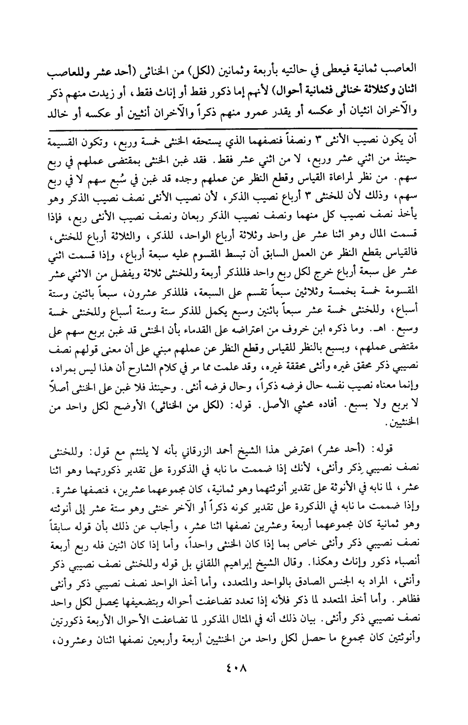 أن يكون نصيب الأنثى ثلاثة ونصفا فنصفها الذي يستحقه الخنثى خمسة وربع ، وتكون القسمة حينئذ من اثنى عشر وربع ، لامن اثنى عشر فقط فقد غبن الخنثى بمقتضى عملهم في ربع سهم ، ومن نظر لمراعاة القياس وقطع النظر عن عملهم وجده قذ غبن في سبع سهم لافي ربع سهم ، وذلك لأن للخنثى ثلاثة أرباع نصيب الذكر ، لأن نصيب الأنثى نصف نصيب الذكر ، وهو يأخذ نصف نصيب كل منهما و نصف نصيب الذكر ربعان ونصف نصيب الأنثى ربع فإذا قسمت المال وهو اثنا عشر على واحد وثلاثة أرباع الواحد للذكر والثلاثة أرباع للخنثى فالقياس بقطع النظر عن العمل السابق أن تبسط المقسوم عليه سبعة أرباع ، وإذا قسمت اثنى عشر على سبعة أرباع خرج لكل ربع واحد فللذكر أربعة وللخنثى ثلاثة ، ويفضل من الاثنى عشر المقسومة خمسة بخمسة وثلاثين سبعا تقسم على السبعة فللذكر عشرون سبعا باثنين وستة أسباع ، وللخنثى خمسة عشر سبعا باثنين وسبع يكمل للذكر ستة وستة أسباع ، وللخنثى خمسة وسبع وما ذكره ابن خروف من اعتراضه على القدماء بأن الخنثى قد غبن بربع سهم على مقتضى عملهم ، وبسبع بالنظر للقياس ، وقطع النظر عن عملهم مبنى على أن معنى قولهم نصف نصيبى ذكر محقق غيره ، وأنثى محققة غيره وقد علمت مما مرّ في كلام الشارح أن هذا ليس بمراد ، وإنما معناه نصف نصيب نفسه حال فرضه ذكرا وحال فرضه أنثى ، وحينئذ فلا غبن على الخنثى أصلاً لابربع ولا بسبع أفاده محشى الأصل . قوله : 16 ( لكل من الخناثى ) : الأوضح لكل واحد من الخنثيين . قوله : 16 ( أحد عسر ) : اعترض هذا الشيخ أحمد الزرقانى بأنه لا يلتئم مع قوله : وللخنثى نصف نصيبي دكر وأنثى ، لأنك إذا إذا ضممت ما نابه في الذكورة على تقدير ذكورتهما وهو اثنا عشر لما نابه في الأنوثة على تقدير أنوثتهما وهو ثمانية كان مجموعهما عشرين فنصفهما عشرة ، وإذا ضممت ما نابه في الذكورة على تقدير كونه ذكرا والآخر خنثى وهو ستة عشر إلى أنوثته وهو ثمانية ، كان مجموعهما أربعة وعشرين نصفها اثنا عشر ، وأحاب عن ذلك بأن قوله سابقا نصف نصيبى ذكر وأنثى خاص بما إذا كان الخنثى واحدا . وأما إذا كان أثنين فله ربع أربعة أنصباء ذكور وإناث وهكذا ، وقال الشيخ إبراهيم اللقانى : بل قوله وللخنثى نصف نصيبى ذكر وأنثى المراد به الجنس الصادق بالواحد والمتعدد ، أما أخذ الواحد نصف نصيبى ذكر وأنثى فظاهر ، وأماأخذ المتعدد لما ذكر فلأنه إذا تعدد تضاعفت أحواله وبتضعيفها يحصل لكل واحد نصف نصيبى ذكر وأنثى . بيان ذلك أنه في المثال المذكور لما تضاعفت الأحوال الأربعة ذكورتين وأنوثتين كان مجموع ما حصل لكل واحد من الخنثيين أربعة وأربعين نصفها اثنان وعشرون