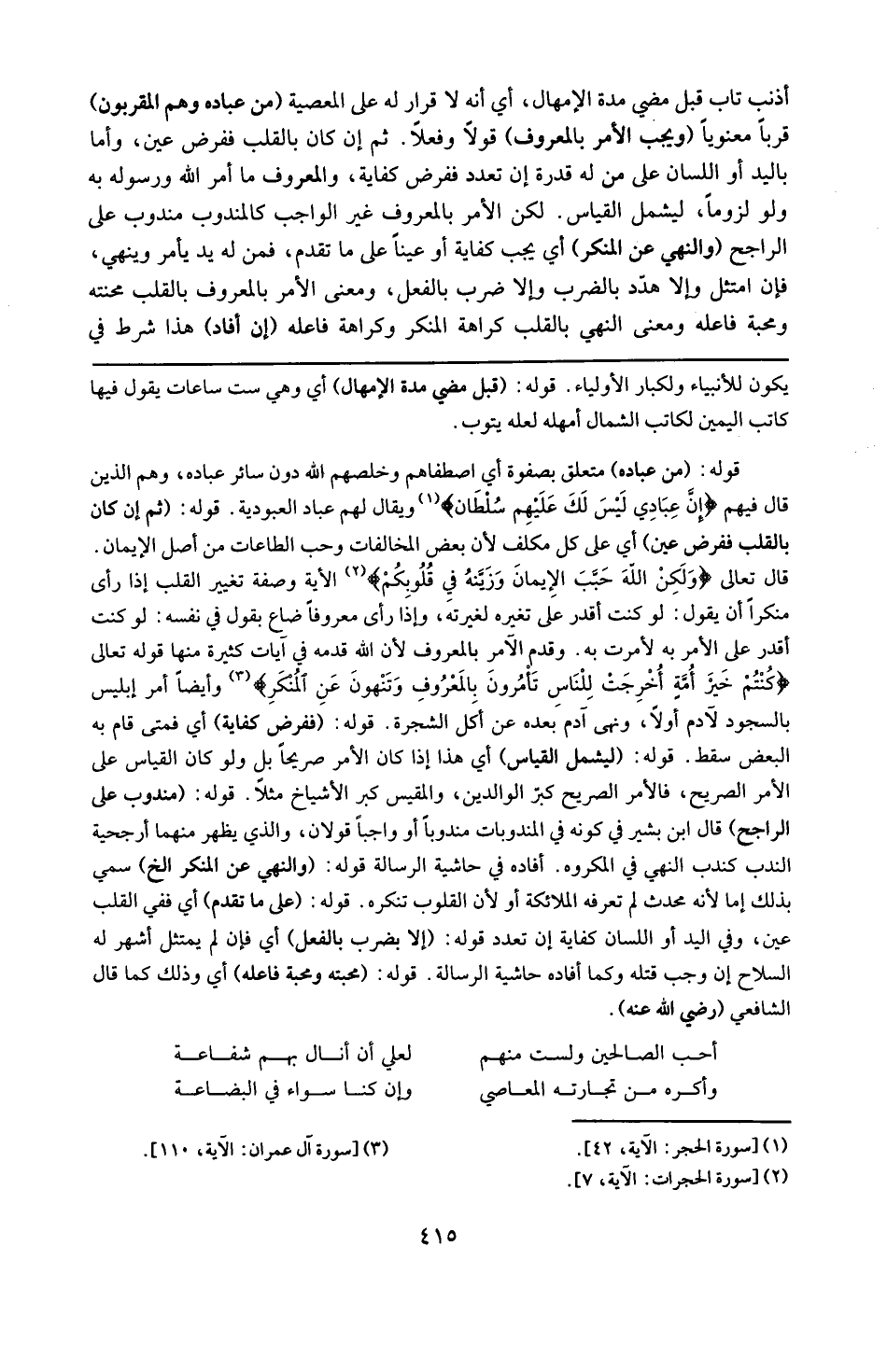 يكون للأنبياء ولكبار الأولياء . قوله : 16 ( فبل مضى مدة الإمهال ) : أي وهي ست ساعات يقول فيها كاتب اليمين لكاتب الشمال أمهله لعله يتوب . قوله : 16 ( من عباده ) : متعلق بصفوة أي اصطفاهم وخلصهم الله دون سائر عباده وهم الذين قال فيهم : { إنَّ عبَادِي ليَسَ لَكَ عَلْيهِمْ سُلطَانٌ } ويقال لهم عباد العبودية . قوله : 16 ( ثم إن كان بالقلب ففرض عين ) : أي على كل مكلف لأن بغض المخالفات وحب الطاعات من أصل الإيمان قال تعالى : { ولكنَّ الله حَبَّبَ إليْكُم الإيمانَ وَزَينَهُ في قُلُوبِكُم } الآية وصفة تغيير القلب إذا رأى منكرا أن يقول أقدرَ على تغيره لغيرته ، وإذا رأى معروفا ضاع . يقول في نفسه لو كنت أقدر على الأمر به لأمرت به ، وقدم الأمر بالمعروف لأن الله قدمه في ايات كثيرة منها قوله تعالى : { كُنْتُمْ خَيْرَ أُمَّة أُخْرِجَتْ للنَّاسِ تَأْمُرُونَ بِالمعْرُفِ وَتَنْهونَ عَنِ المُنْكَرِ } وايضا أمر إبليس بالسجود لآدم أولاً ونهى ادم بعده عن أكل الشجرة . قوله : 16 ( ففرض كفاية ) : أي فمتى قام به البعض سقط . قوله : 16 ( ليشمل القياس ) : أي هذا إذا كان الأمر صريحا بل لو كان القياس على الأمر الصريح ، فالأمر الصريح كبرّ الوالدين والمقيس كبرّ الأشياخ مثلا . قوله : 16 ( مندوب على الراجح ) : قال ابن بشير في كونه في المندوبات مندوبا أو واجبا قولان ، والذي يظهر منهما أرجحية الندب كندب النهى في المكروه أفاده في حاشية الرسالة . قوله : 16 ( والنهى عن المنكر ) إلخ : سمى بذلك إما لأنه محدث لم تعرفه الملائكة أو لأن القلوب تنكره . قوله : 16 ( على ما تقدم ) : أي ففي القلب عين وفي اليد أو اللسان كفاية إن تعدد . قوله : 16 ( وإلا ضرب بالفعل ) : أي فإن لم يمتثل أشهر له السلاح إن وجب قتله كما أفاده في حاشية الرسالة . قوله : 16 ( محبته ومحبة فاعله ) : أي وذلك كما قال الشافعي رضي الله عنه : (