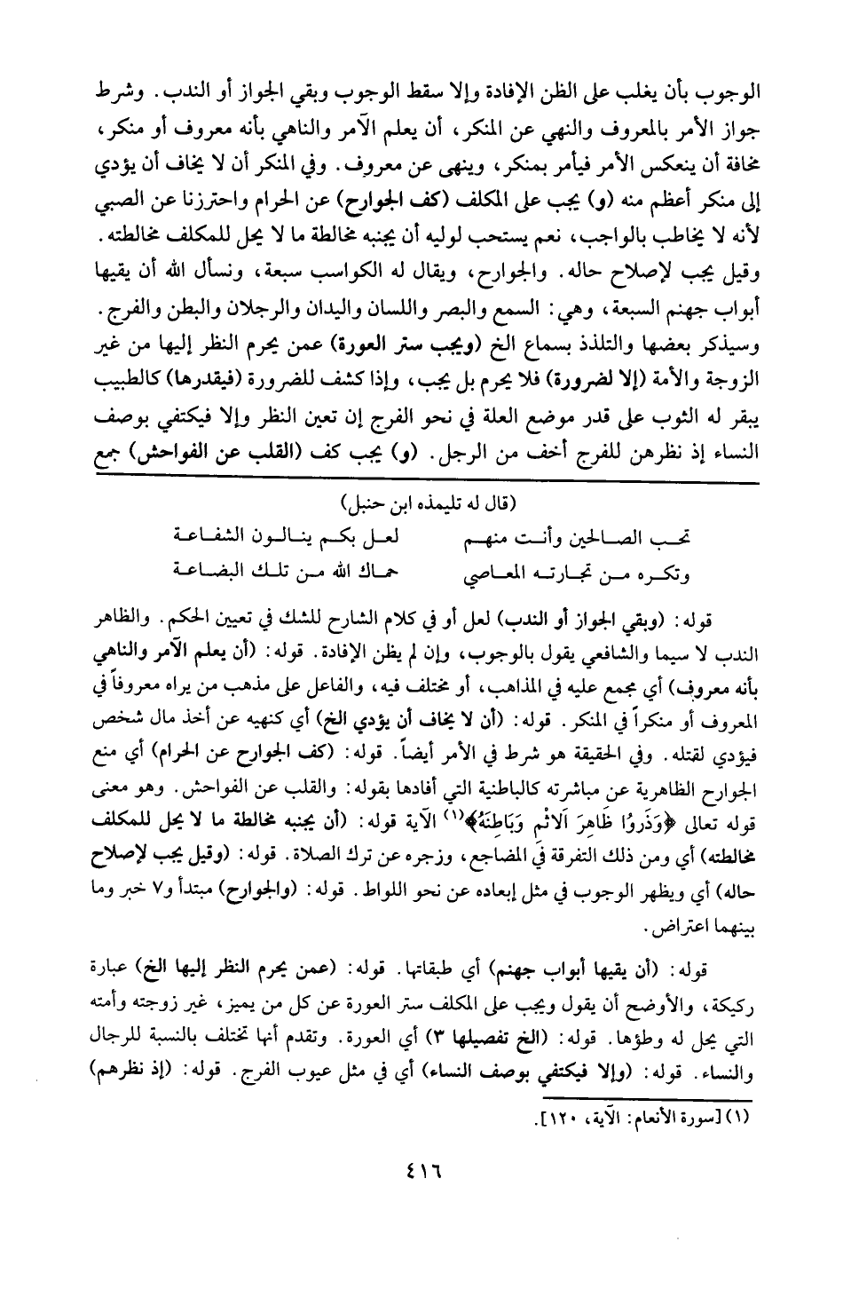 قوله : 16 ( وبقى الجواز أو الندب ) : لعل أو في كلام الشارح للشك في تعين الحكم والظاهر الندب ولا سيما الشافعي يقول بالوجوب وإن لم يظن الإفادة . قوله : 16 ( أن يعلم الآمر والناهي بأنه معروف ) : أي مجمع عليه في المذاهب أو مختلف فيه والفاعل على مذهب من يراه معروفا في المعروف أو منكرا في المنكر . قوله : 16 ( أن لايخاف أن يؤدي ) إلخ : أي كنهيه عن أخذ مال شخص فيؤدي لقتله ، وفي الحقيقة هو شرط في الأمر أيضا . قوله : 16 ( كف الجوارح عن الحرام ) : أي منع الجوارح الظاهرية عن مباشرته كالباطنية التي أفاده بقوله والقلب عن الفواحش وهو معنى قوله تعالى : { وذَرُوا ظاهِرَ الإثْمِ وَبَاطِنَهُ } قوله : 16 ( أن يجنبه مخالطة ما لا يحل للمكلف مخالطته ) : أي ومن ذلك التفرقة في المضاجع وزجره عن ترك الصلاة . قوله : 16 ( وقيل يجب لإصلاح حاله ) : أي ويظهر الوجوب في مثل إبعاده عن اللواط . قوله : 16 ( والجوارح ) : مبتدأ وسبعة خبره وما بينهما اعتراض . قوله : 16 ( أن يقيها أبواب جهنم ) : أي طبقاتها . قوله : 16 ( عمن يحرم النظر إليها ) إلخ : عبارة ركيكة والأوضح أن يقول ويجب على المكلف ستر العورة عن كل ما يميز العورة غير زوجته وأمته التي يحل لها وطؤها . قوله : 16 ( إلخ تفصيلها ) أي العورة وتقدم أنها تختلف بالنسبة للرجال والنساء قوله : 16 ( وإلا فيكتفى بوصف النساء ) : أي في مثل عيوب الفرج . قوله : 16 ( إذ نظرهم )