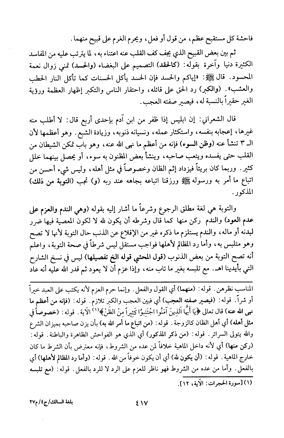 : المناسب نظرهن . قوله : 16 ( منهما ) : أي القول والفعل وإنما حرم العزم لأنه يكتب على العبد خيرا وشرا . قوله : 16 ( فيصير صفته العجب ) : أي فبين العجب والكبر تلازم . قوله : 16 ( فإنه من أعظم مانها الله عنه ) : قال تعالى : { يأَيُّهَا الَّذيِن امَنُوا اجْتَنبُوا كثيرا مِنَ الظنِّ } قوله : 16 ( خصوصا في مثل أهله ) : أي أهل الظان كالزوجة . قوله : 16 ( من اتباع ماأمر الله به ) : بأن يزن صاحبه بميزان الشرع والله يتولى السرائر . قوله : 16 ( من ذلك المذكور ) : أي الذي هو الفواحش الظاهرة والباطنة . قوله : 16 ( ركن منها ) : أي لأنه داخل الماهية خلافا لمن عده من الشروط فإنه معترض بأن الشرط ما كان خارج الماهية .
