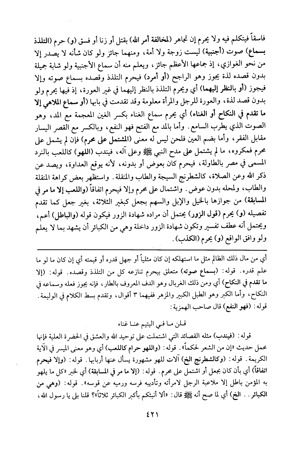 قوله 16 ( فيندب ) : مثله القصائد التي اشتملت على توحيد الله والعشق في الحضرة العلية فإنها محمل حديث : ( إن من الشعر لحكما ) . قوله : 16 ( واللهو الحرام كالعب ) : أي وهو معنى الميسر في الآية الكريمة . قوله : 16 ( كالشطرنج ) إلخ : الات للهو مشهورة يسأل عنها أربابها . قوله 16 ( وإلا فيحرم اتفاقا ) : أي بأن كان بجعل أو اشتمل على محرم . قوله : 16 ( إلا ما مرّ في المسابقة ) : أي لخبر : ( كل لهو يلهو به المؤمن باطل إلا ملاعبة الرجل لامرأته ، وتأديبه فرسه ، ورميه قوسه ) قوله : 16 ( وهي من الكبائر ) : إلخ : أي لما صح أنه قال : ( ألا أنبئكم بأكبر الكبائر ثلاثا ؟ قلنا بلى يا رسول الله .