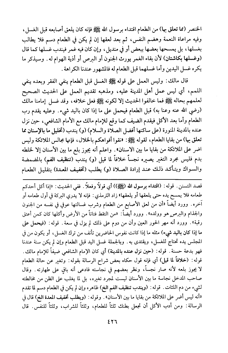 قصد التسنن . قوله 16 ( اقتداء برسول الله ) : أي قولا وفعلا ففي الحديث : ( إذا أكل أحدكم طعامه فلا يمسح يده حتى يلعقها ) ، زاد الترمزي : ( فإنه لايدري البركة في أول طعامه أو اخره ) وورد أيضا : ( أن من لعق الأصابع من الطعام وشرب غسالتها عوفي في نفسه من الجنون والجذام والبرص هو وولده ) وورد أيضا : ( من التقط فتاتا من الأرض وأكلها كان كمن أعتق رقبة ) وورد : ( إنه مهر الحور العين وأن من داوم على ذلك لم يزل في لم يزل في سعة ) . قوله : 16 ( فيحمل على ما إذا كان باليد شىء ) : مثله ما إذا كانت نفوس الحاضرين تأنف من ترك الغسل ، أو يكون من في المجلس يده تحتاج للغسل ويقتدى به ، وبالجملة غسل اليد قبل الطعام وإن لم يكن سنة عندنا فهو بدعة حسنة . قوله : 16 ( حين نزل عنده بالمدينة ) : أي كان الإمام الشافعي ضيفا للأمام مالك . قوله : 16 ( خلافا لما قيل ) : أي فإنه قول حكاه بعض شراح الرسالة بقوله وتغير عن حالة الطعام لايجوز بلعه ؛ لأنه صار نجسا ونظر بعضهم في نجاسته وفادعى أنه باق على طهارته ، وقال صاحب المدخل : نجاسة ما بين الأسنان ليست لمجرد تغيره بل لما يغلب على الظن من مخالطته لشىء من دم اللثاث . قوله : 16 ( ويندب تنظيف الفم ) إلخ : ظاهره وإن لم يكن في الطعام دسم لما تقدم أنه ( ليس أضر على الملائكة من بقايا ما بين الأسنان ) قوله ويطلب تخفيف المعدة إلخ قال في الرسالة : ومن اداب الأكل أن تجعل بطنك ثلثا للطعام وثلثا للشراب وثلثا للنفس ، قال