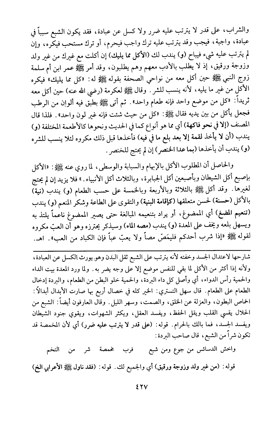 شارحها لاعتدال الجسد وخفته لأنه يترتب على الشبع ثقل البدن وهو يورث الكسل عن العبادة ، ولأنه إذا أكثر من الأكل لما بقى للنفس موضع إلا على وجه يضر به . ولما ورد : ( المعدة بيت الداء والحمية رأس الدواء ) أي : ( وأصل كل داء البردة ) والحمية خلو البطن من الطعام ، والبردة إدخال الطعام على الطعام . قال سهل التسترى : الخسير كله في خصال أربع بها صارت الأبدال أبدال : إخماص البطون ، والعزلة عن الخلق ، والصمت وسهر اليل . وقال العارفون أيضا : الشبع من الحلال يقسي القلب ويقل الحفظ ويفسد العقل ويكثر الشهوات ويقوى جنود الشيطان وبفسد الجسد فما بالك بالحرام . قوله : 16 ( على قدر لايترتب عليه ضرر ) : أي لأن المخمصة قد تكون شرا من الشبع قال صاحب البردة : (