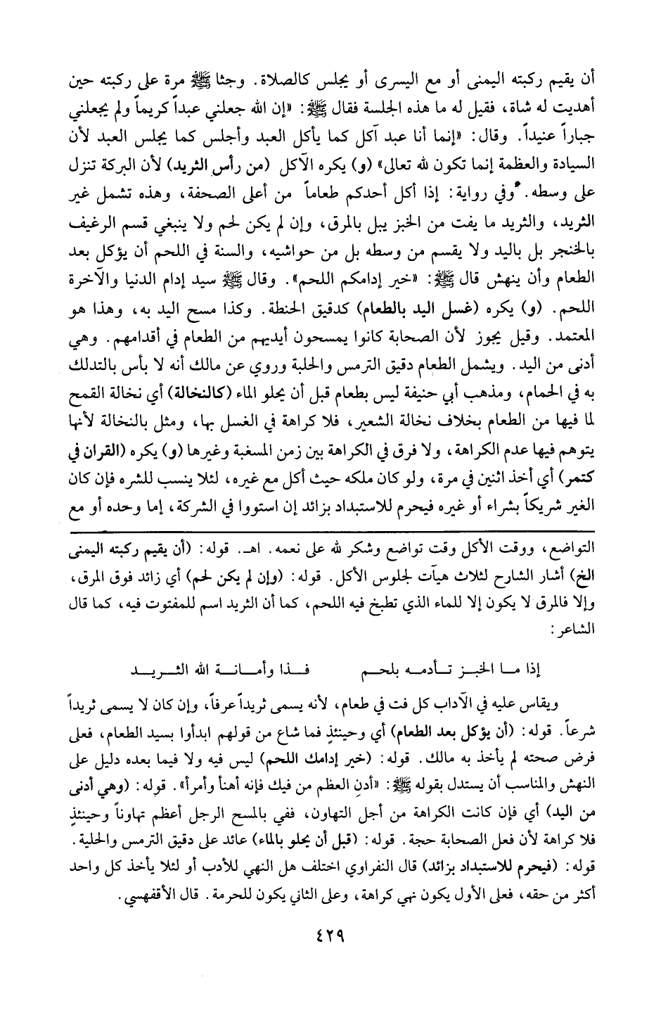 التواضع وقت الأكل ووقت تواضع وشكر لله على نعمه . قوله : 16 ( أن يقيم على ركبته اليمنى ) إلخ : أشار الشارح لثلاث هيئات لجلوس الآكل . قوله : 16 ( وإن لم يكن لحم ) : أي زائد فوق المرق والمرق لايكون إلا للماء الذي طبخ فيه اللحم كما أن الثريد اسم للمفتوت فيه كما قال الشاعر : (