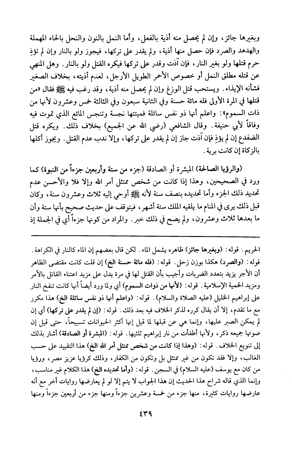 الحريم . قوله : 16 ( وبغيرها جائز ) : ظاهره يشمل الماء لكن قال بعضهم إن الماء كالنار في الكراهة . قوله : 16 ( والصرد ) هكذا بوزن زحل . قوله : 16 ( فله مائة حسنة ) إلخ : إن قلت كان مقتضى الظاهر أن الأجر يزيد بتعدد الضربات ؟ وأجيب بأن القتل لها في مرة يدل على مزيد اعتناء القاتل بالأمر ومزيد الحمية الإسلامية . قوله : 16 ( لأنها من ذوات السموم ) : أي ولما ورد أيضا أنها كانت تنفخ النار على إبراهيم الخليل عليه الصلاة والسلام . قوله : 16 ( واعلم أنها ذو نفس سائلة ) إلخ : هذا مكرر ما تقدم إلى أن يقال : كرره لذكر الخلاف فيه بعد ذلك . قوله : 16 ( إن لم يقدر على تركها ) : أي إن لم يكن الصبر عليها وإنما نهى عن قتلها لما قيل إنها أكثر الحيوانات تسبيحا حتى قيل إن صوتها جميعه ذكر ولأنها أطفأت نار إبراهيم ثلثيها . قوله : 16 ( المبشرة أو الصادقة ) : أشار بذلك إلى تنويع الخلاف . قوله : 16 ( وهذاإذا كانت من شخص ممتثل أمر الله ) إلخ : هذا التقيد على حسب الغالب وإلا فقد تكون من غير ممتثل بل وتكون من الكفار ، وذلك كرؤيا عزيز مصر ورؤيا من كان مع يوسف عليه السلام في السجن . قوله : 16 ( وأما تحديده ) إلخ : هذا الكلام غير مناسب وإنما الذي قاله شراح هذا الحديث أن هذا الجواب لايتم إلا لو لم يعارضها روايات أخر مع أنه عارضها روايات كثيرة منها : ( جزء من خمسة وعشرين جزءا ) ومنها جزء من أربعين جزءا ومنها