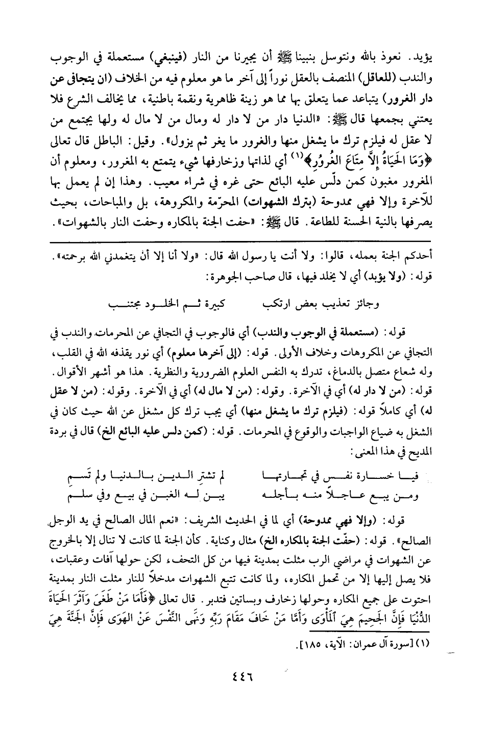 بين له الغبن في بيع وفي سلم ) قوله : 16 ( وإلا فهي ممدوحة ) : أي لما في الحديث الشريف : ( نعم المال الصالح في يد الرجل الصالح ) . قوله : 16 ( حفت الجنة بالمكارة ) إلخ : مثال وكناية كأنّ الجنة لما كانت لاتنال إلا بالخروج عن الشهوات في مراضى الرب ، مثلت بمدينة فيها كل التحف لكن حولهاآفات وعقبات فلا يصل إليها إلا من تحمل المكاره ، ) 16 ( ولما كان تتبع الشهوات مدخلا للنار مثلت النار بمدينة احتوت على جميع المكاره وخولها زخارف وبساتين فتدبر قال تعالى : { فَأمَّا مَنْ طَغَى وآثر الحيَاة الدُّنيْاَ فإنَّ الجَحِيمَ هيَ المأوَى وأما من ختف مقام ربه منهى النفس عن الهوى فإن الجنة