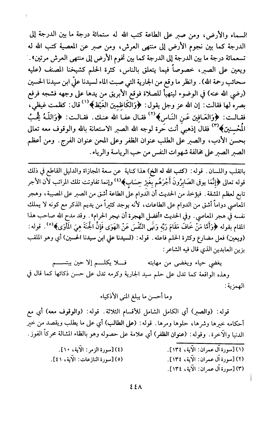 بالقلب واللسان . قوله : 16 ( كتب الله له ) إلخ : هذا كناية عن سعة المجازاة والدليل القاطع في ذلك قوله : تعالى : { إنَّما يُوفَّى الصَّابِرُونَ أجرْهُمْ بِغيْرِ حِسَاب } وإنما تفاوتت تلك المراتب ، لأن الأجر تابع لعظم المشقة فيؤخذ من الحديث أن الدوام على الطاعة أشق من الصبر على المصيبة ، وهجر المعاصي دواما أشق من الدوام على الطاعات ، لأنه يوجد كثيرا من يديم الذكر مع كونه لايملك نفسه في هجر المعاصي وفي الحديث : ( أفضل الهجرة أن تهجر الحرام } ، ) 16 ( وقد مدح الله صاحب هذا المقام بقوله : { وأمَّا مَنْ خافَ مَقَامَ رَبَهِ وَنَهى النَّفْسَ عَنِ الهَوى فإنَّ الجَّنَةَ هِىَ الَمأوَى } . قوله : 16 ( ويعين ) : فعل مضارع وكثرة الحلم فاعله . قوله : 16 ( لسيدنا عَلى ابن سيدنا الحسين ) : أي وهو الملقب بزين العابدين الذي قال فيه الشاعر : يغضى حياء ويغضى من مهابته فلا يكلم إلا حين يبتسم وهذه الواقعة كما تدل على حلم سيد الجارية وكرمه تدل على حسن ذكائها كما قال في الهمزية : (