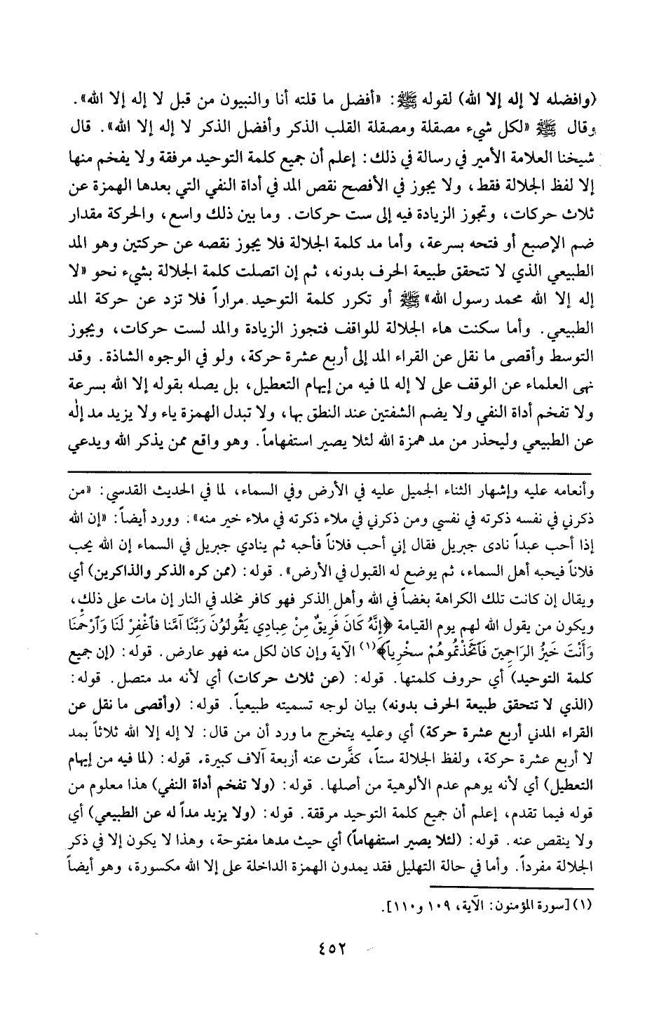 وإنعاماته عليه وإشهار الثناء الجميل عليه في الأرض والسماء لما في الحديث القدسي : ( من ذكرني في نفسه ذكرته في نفسي ومن ذكرني في ملأ ذكرته في ملإ خير منه ) وورد أيضا : ( إن الله إذا أحب عبدا نادى جبريل فقال إني أحب فلانا فأحبه ثم ينادي جبريل في السماء إن الله يحب فلانا فيحبه أهل السماء ثم يوضع له القبول في الأرض ) . قوله : 16 ( ممن كره الذكر والذاكرين ) : أي ويقال : إن كانت تلك الكراهة بغضا في الله وأهل الذكر فهو كافر مخلد في النار إن مات على ذلك ويكون مما يقول الله لهم يوم القيامة : { إنَّه كاَنَ فَرِيقٌ منْ عِبَادي يَقُولُونَ ربنا آمنَّا فاغفِرْ لَنَا وارحَمْنَا وإنتَ خَيرُ الرَّاحميَن فاتخذْتُموهُم سِخْريا } الآية وإن لكسل منه فهو عاص . قوله : 16 ( أن جميع كلمة التوحيد ) : أي حروف كلمتها . قوله : 16 ( عن ثلاث حركات ) : أي لأنه مد منفصل . قوله : 16 ( الذي لاتتحقق طبيعة الحرف بدونه ) : بيان لوجه تسميته طبيعيا قوله : 16 ( وأقصى ما نقل عن القراء المد إلى أربع عشرة حركة ) : أي وعليه يتخرج ماورد أن ( من قال لاإله إلاالله ثلاثا بمد لاربع عشرة حركة ولفظ الجلالة ستا كفرت عنه أربعة آلاف كبيرة ) . ) ) 16 ( 16 ( قوله : 16 ( لما فيه من إيهام التعطيل ) : أي لأنه يوهم عدم الألوهية من أصلها . قوله : 16 ( ولا تفخم أداة النفي ) : هذا معلوم من قوله فيما تقدم : اعلم أن جميع كلمة التوحيد مرققة . قوله : 16 ( ولا يزيد مدا له عن الطبيعي ) : أي ولا ينقص عنه . قوله : 16 ( لئلا يصير استفهاما ) : أي حيث مدها مفتوحة وهذا لايكون إلا في ذكر الجلالة مفردا ، وأما في حالة التهليل فقد يمدون الهمزة الداخلة على إلاالله مكسورة وهو أيضا