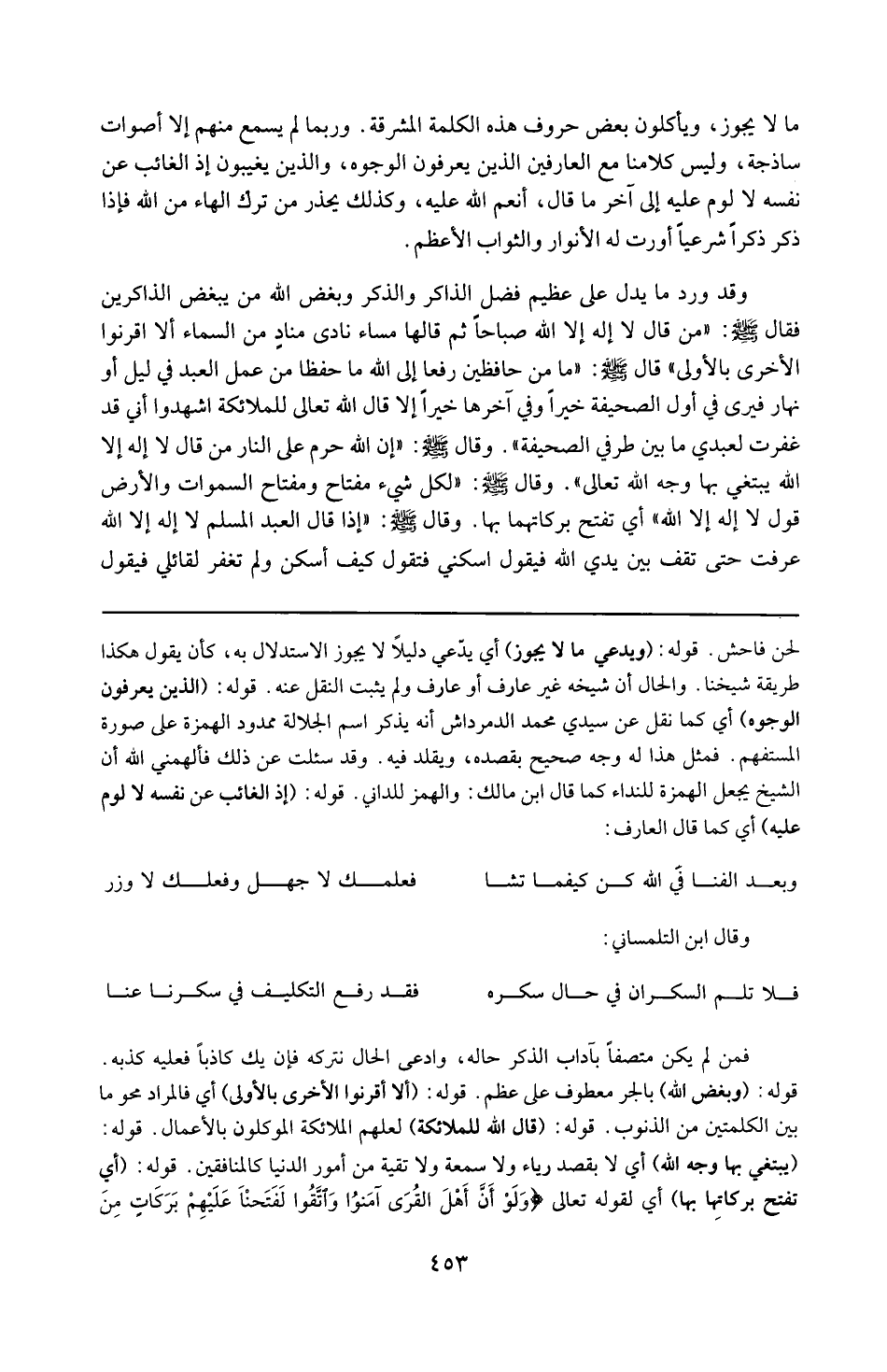 لحن فاحش . قوله : 16 ( ويدّعي مالا يجوز ) : أي يدعي دليلا لايجوز الاستدلال به كأن يقول هكذا طريقة شيخنا ، والحال أن شيخه غير عارف أو عارف أو ولم يثبت النقل عنه . قوله : 16 ( الذين يعرفون الوجوه ) : أي كمل نقل عن سيدى محمد الدمرداش أنه يذكراسم الجلالة ممدودة الهمزة على صورة المستفهم فمثل هذاله وجه صحيح يقصده ويقلد فيه ، وقد سئلت عن ذلك فألهمني الله أن الشيخ يجعل الهمزة للنداء كما قال ابن مالك والهمزة للداني . قوله : 16 ( إذ الغائب عن نفسه لالوم عليه ) : أي كما قال العارف : (