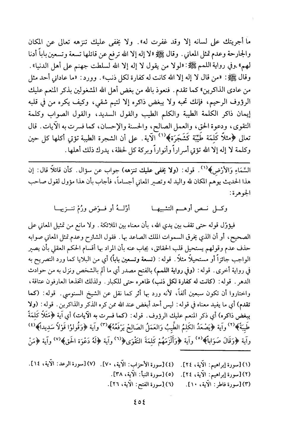 فيؤول قوله حتى تقف بين يدي الله بأن معناه بين يدي الملائكة ، ولامانع من تمثيل المعاني على الصحيح أو أن الذي يخرق السموات الملك الصاعد بها . فقول الشارح وعدم تمثل المعانى صوابه حذف عدم وقولهم يستحيل قلب الحقائق يجاب عنه بأن المراد بهاأقسام الحكم العقلي بأن يصير الواجب جائزاومستحيلا مثلا . قوله : 16 ( تسعة وتسعين بابا ) : أي من البلايا كما ورد التصريح في رواية أخرى . قوله : 16 ( وفي رواية اللمم ) : بالفتح مصدر أي ما ألم بالشخص ونزل به من حوادث الدهر . قوله : 16 ( كانت له كفارة لكل دنب ) : ظاهره حتى للكبائر ولذلك اتخذها العارفون عتاقه واختاروا أن تكون سبعين ألفا لأنه ورد بها أثر كما نقل عن الشيخ السنوسي . قوله : 16 ( كما تقدم ) : أي ما يفيد معناه في قوله ليس أحد أبغض عند الله ممن كره الذكر والذاكرين . قوله : 16 ( ولا يبغض ذاكره ) : أي ذاكر المنعم عليك الرؤوف . قوله : 16 ( كما فسرت به الآيات ) : أي الآية : { مَثَلا كَلمَةً طيبةً } واية : { إليْهِ يَصْعَدُ الكَلمُ الطَّيبُ والعَمَلُ الصَّالحُ يَرْفعهُ } وآية : { وقولُوا قوَلا سَديدا } وآية : { وقَالَ صَوابا } وآية { وألزَمهُمْ كَلِمَةَ التَّقْوى } وآية { لهُ دعوة الحَق } وآية { مَنْ