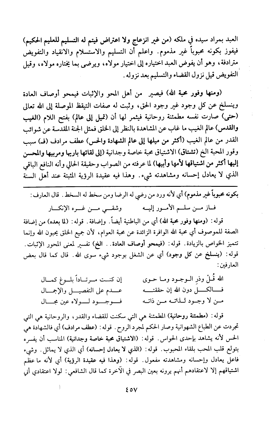 قوله : ) ) 16 ( 16 ( 16 ( مطمئنة روحانية ) : المطمئنة هي التي سكنت للقضاء والقدر والروحانية هي التي تجردت عن الطباع الشهوانية وصار الحكم امجرد الروح . قوله : 6 ( عطف مراد ) : أي فالشهادة هي الحس لأنه يشاهد بإحدى الحواس . قوله : 6 ( الاشتياق محبة خاصة وجدانية ) : المناسب أن يفسره بتلوع قلب المحب بلقاء المحبوب . قوله : 6 ( الذ ي لايعادله إحسان ) : أي الذي لايماثل وشىء فاعل يعادل واحسانه ومشاهدته مفعول . قوله : 6 ( وهذا فيه عقيدة الرؤية ) : أي لأنه ماعظم اشتياقهم الاعتقادهم أنهم يرونه بعين البصر في الآخرة كما قال الشافعي : لولا اعتقادي أني