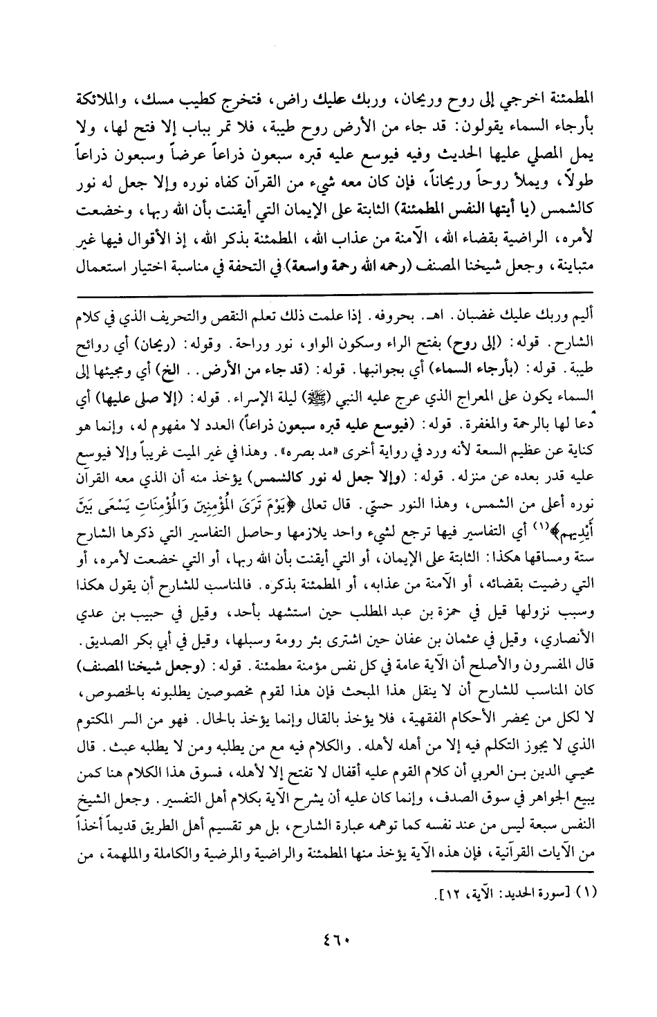 و حاصل التفاسير التي ذكرها الشارح ستة و مساقها هكذا الثابتة على الإيمان ، أو التي أيقنت بأن الله ربها ، أو التي خضعت لأمره ، أو التي رضيت بقضائه ، أو الآمنة من عذابه ، أو المطمئنة بذكره فالمناسب للشارح أن يقول هكذا . و سبب نزولها قيل في حمزة بن عبد المطلب حين استشهد بأحد و قيل في حبيب ابن عديّ الأنصاري ، و قيل في عثمان بن عفان حين اشترى بئر رومة و سلبها ، و قيل في أبي بكر الصديق ، قال المفسرون و الأصح أن الآية عامة في كل نفس مؤمنة مطمئنة .