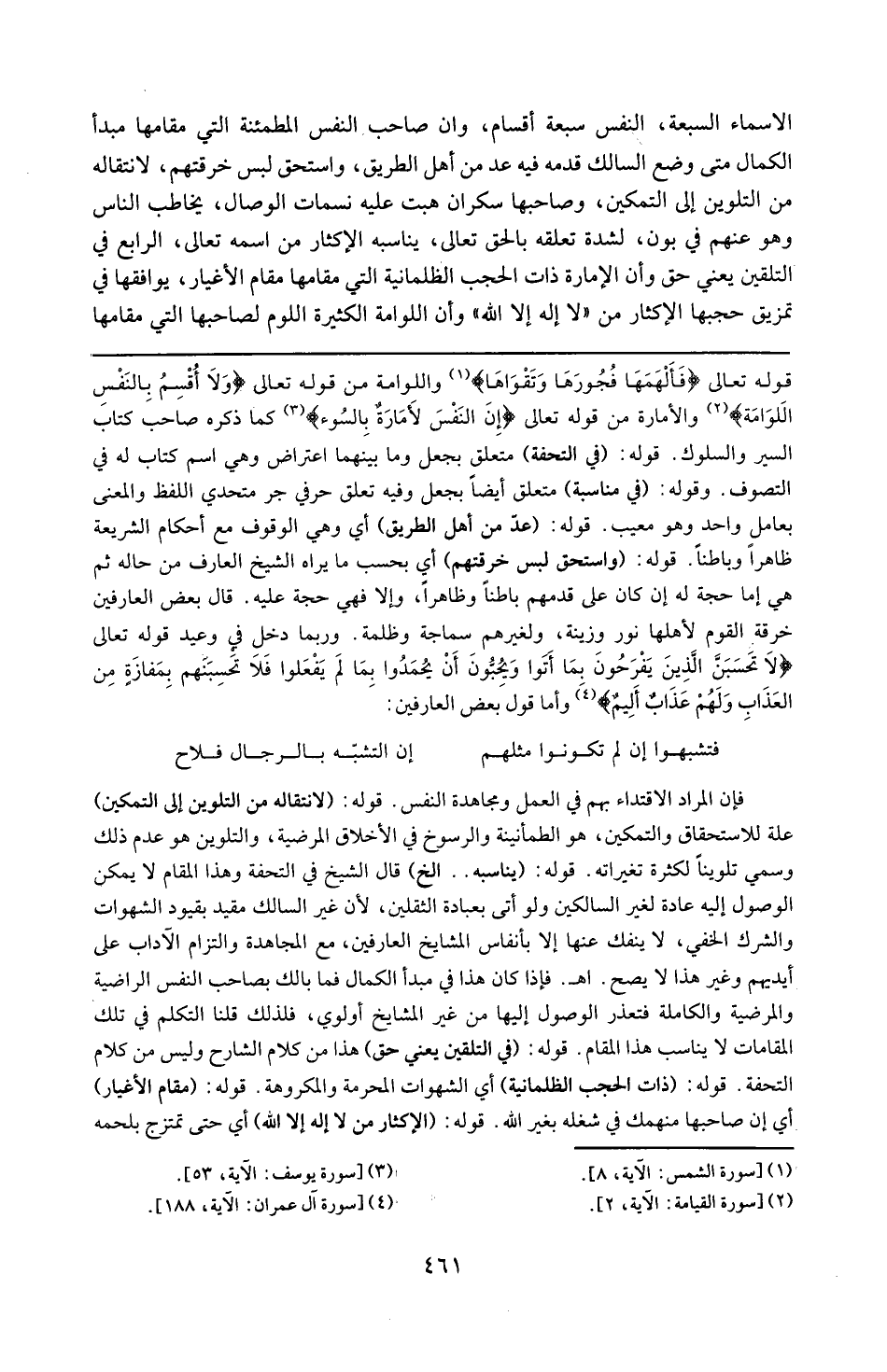 قوله : 16 ( يناسبه ) الخ : قال الشيخ في التحفة و هذا المقام لا يمكن الوصول إليه عادة لغير السالكين و لو أتي بعبادة الثقلين ؛ لأن غير السالك مقيد بقيود الشهوات و الشرك الخفي لا ينفك عنها إلا بأنفاس المشايخ العارفين مع المجاهدة و التزام الآداب على أيديهم و غير هذا لا يصح ( اه ) فإذا كان هذا في مبدأ الكمال فما بالك بصاحب النفس الراضية و المرضية و الكاملة ، ) ) 16 ( 16 ( فتعذر الوصول إليها من غير المشايخ أو لوى فلذلك قلنا التكلم في تلك المقامات لا يناسب هذا المقام .