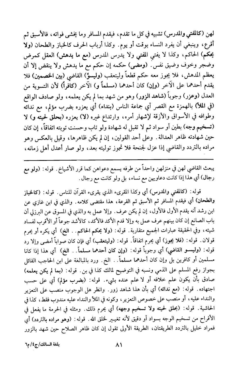 يبعث القاضي لهن في منزلهن واحداً من طرفه يسمع داعواهن كما قرر الأشياخ . قوله : 16 ( ولو مع رجال ) : أي هذا إذا كانت دعاويهن مع نساء ، بل ولو كانت مع رجال . قوله : 16 ( كالمفتى والمدرس ) : أي وكذا المقرى الذي يقرىء القرآن للناس . قوله : ) 16 ( 16 ( كالخباز والطحان ) : أي فيقدم المسافر ، ثمَّ الأسبق ، ثمَّ القرعة ، هذا مقتضي كلامه ، والذي في ابن غازي عن ابن رشد أنه يقدم الأول فالأول ، إن لم يكن عرف وإلا عمل به ، والذي في المواق عن البرزلى أن أرباب الصنائع إن كان بينهم عرف عمل به ، وإلا قدم الآكد فالآكد كالأشد جوعاً أو الأقرب لفساد شيئه وفي الحقيقة عبارات الجميع متقاربة . قوله : 16 ( ولا يحكم الحاكم ) الخ : أي يكره أو يحرم قولان . قوله : 16 ( فلا يجوز ) : أي يحرم اتفاقاً . قوله : 16 ( وليتعقب ) : أي فإن كان صواباً أمضى وإلا رد . قوله : 16 ( وليسوَّ القاضي ) : أي وجوباً . قوله : 16 ( وإن كان أحدهما مسلماً ) الخ : أي هذا إذا كانا مسلمين أو كافرين ، بل وإن كان أحدهما مسلماً الخ ، وردَّ بالمبالغة على ابن الحاجب القائل بجواز رفع المسلم على الذمى و نسبه في التوضيح لمالك كذا في ( بن ) . قوله : 16 ( بما لم يكن يعلمه ) : صادق بأن يكون علم خلافه أو لا علم عنده بشيء . قوله : 16 ( بضرب مؤلم ) : أي على حسب اجتهاده . قوله : 16 ( مع ندائه ) : أي بأن هذا شاهد زور وانظر هل الوجوب منصب على التعزير والنداء عليه أو منصب على خصوص التعزير وكونه في الملأ والنداء عليه مندوب فقط كذا في الحاشية . قوله : 16 ( بحلق لحيته و لا تسخيم وجهه ) : أي يحرم ذلك ومثله في الحرمة ما يفعل في الأفراح من تسخيم الوجه بسواد أو دقيق لأنه تغيير لخلق الله . قوله : 16 ( وهو مراده بالتردد ) : أي فمراد خليل بالتردد الطريقتان ، الطريقة الأولى تقول : إن كان ظاهر الصلاح حين شهد بالزور