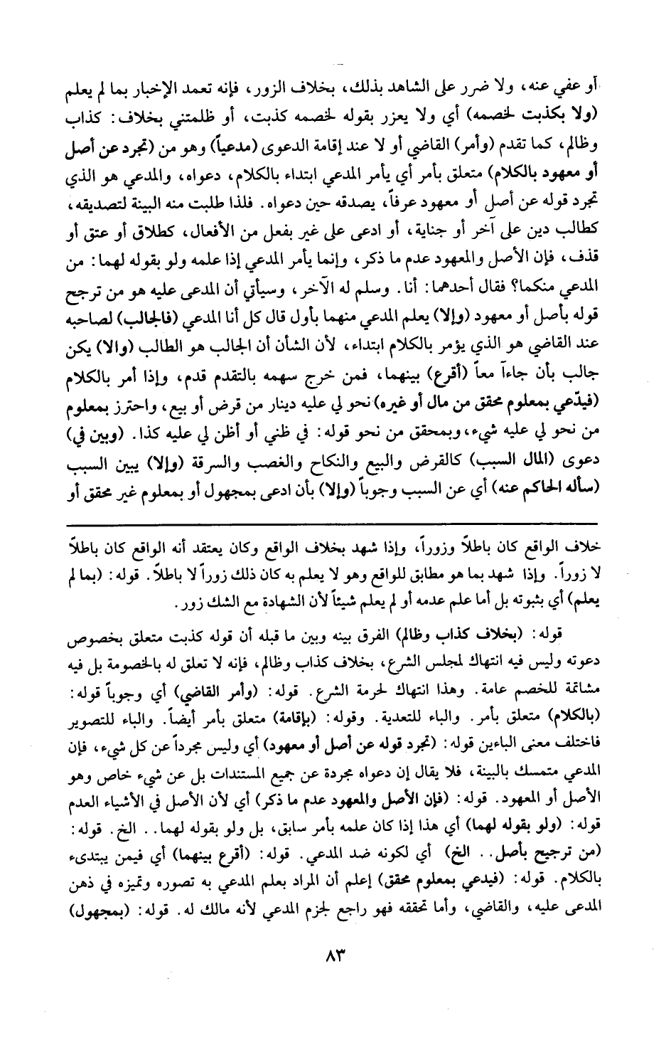 خلاف الواقع كان باطلاً وزوراً ، وإذا شهد بخلاف الواقع وكان يعتقد أنه الواقع كان باطلاً لا زوراً ، وإذا شهد بما هو مطابق للواقع وهو لا يعلم به كان ذلك زوراً لا باطلاً . قوله : 16 ( بما لم يعلم ) : أي بثبوته بل إما علم عدمه أو لم يعلم شيئاً ؛ لأن الشهادة مع الشك زور . وقوله : 16 ( بخلاف كذاب وظالم ) : الفرق بينه وبين ما قبله أن قوله كذبت متعلق بخصوص دعوته وليس في انتهاك لمجلس الشرع . بخلاف كذاب وظالم فإنه لا تعلق له بالخصومة ، بل فيه مشاتمة للخصم عامة وهذا انتهاك لحرمة الشرع . قوله : 16 ( وأمر القاضي ) : أي وجوباً . قوله : 16 ( بالكلام ) : متعلق بأمر و الباء للتعدية . قوله : 16 ( بإقامة ) : متعلق بأمر أيضاً والباء للتصوير فاختلف معنى الباءين . قوله : 16 ( تجرد قوله عن أصل أو معهود ) : ) 16 ( أي وليس مجرداً عن كل شيء فإن المدعى متمسك بالبينة فلا يقال إن دعواه مجردة عن جميع المستندات ، بل عن شيء خاص وهو الأصل أو المعهود . قوله : 16 ( فإن الأصل والمعهود عدم ما ذكر ) : أي لأن الأصل في الأشياء العدم . قوله : 16 ( ولو بقوله لهما ) : أي هذا إذا كان علمه بأمر سابق بل ولو بقوله لهما الخ . قوله : 16 ( من ترجح قوله بأصل ) : الخ : أي لكونه ضد المدعي . قوله : 16 ( أقرع بينهما ) : أي فيمن يبتدىء بالكلام . قوله : 16 ( فيدعى بينهما ) : اعلم أن المراد بعلم المدعى به تصوره وتميزه في ذهن المدعى والمدعى عليه والقاضي . وأما تحققه فهو راجع لجزم المدعى لأنه مالك له . قوله : 16 ( بمجهول )