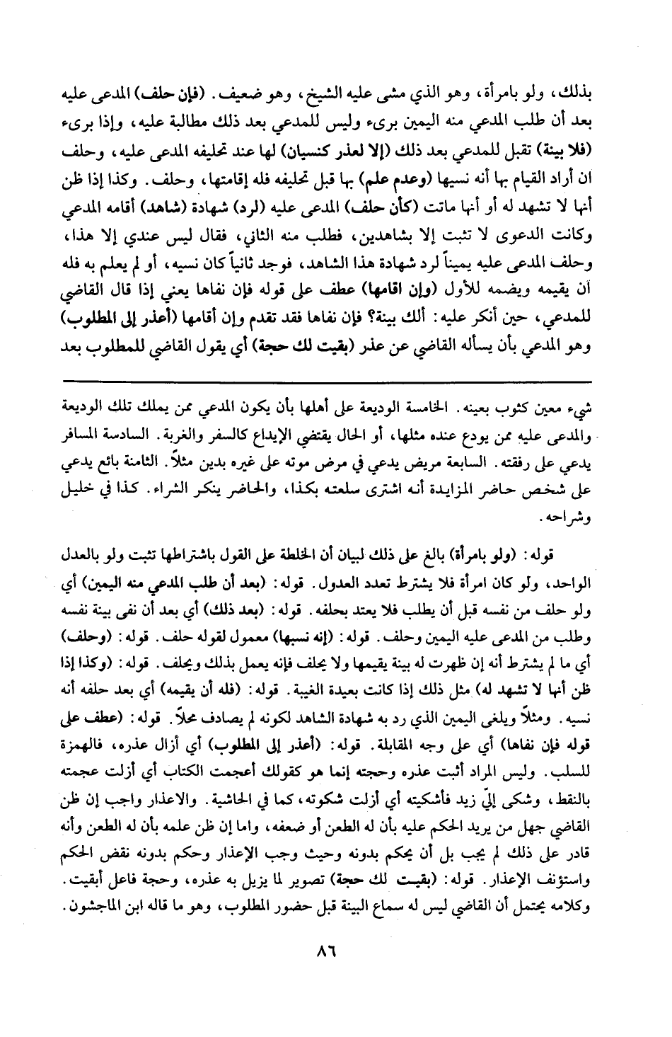 شيء معين كثوب بعينه . الخامسة : الوديعة على أهلها بأن يكون المدعى ممن يملك تلك الوديعة والمدعى عليه ممن يودع عنده مثلها والحال يقتضي الإيداع كالسفر والغربة . السادسة : المسافر يدعي على رفقته . السابعة : مريض يدعى في موته على غيره بدين مثلاً . الثامنة : بائع يدعى على شخص حاضر المزايدة أنه اشترى سلعته بكذا و الحاضر ينكر الشراء كذا في خليل و شراحه . قوله : 16 ( ولو بامرأة ) : بالغ على ذلك لبيان أن الخلطة على القول باشتراطها تثبت ولو بالعدل الواحد ولو كان امرأة فلا يشترط تعدد العدول . قوله : 16 ( بعد أن طلب المدعى منه اليمين ) : أي وأما لو حلف من نفسه قبل أن يطلب فلا يعتد بحلفه . قوله : 16 ( بعد ذلك ) : أي بعد أن نفي بينة نفسه وطلب من المدعى عليه اليمين و حلف . قوله : 16 ( إنه نسيها ) : معمول لقوله حلف . قوله : 16 ( و حلف ) : أي مالم يشترط أنه إن ظهرت له بينة يقيمها ولا يحلف فإنه يعمل بذلك ولا يحلف . قوله : 16 ( و كذا إذا ظن أنها لا تشهد ) : مثل ذلك إذا كانت بعيدة الغيبة . قوله : 16 ( فله أن يقيمه ) : أي بعد حلفه إنه نسيه مثلاً ويلغى اليمين الذي رد به شهادة الشاهد لكونه لم يصادف محلاً . قوله : 16 ( عطف على قوله فإن نفاها ) : أي على وجه المقابلة . قوله : 16 ( أعذر إلى المطلوب ) : أي زال عذره فالهمزة للسلب وليس المراد أثبت عذره وحجته إنما هو كقوله : أعجمت الكتاب ، أي أزلت عجمته بالنقط ، وشكى إليَّ زيد فأشكيته ، أي زلت شكايته يأتي كما في الحاشية ، و الإعذار واجب إن ظن القاضي جهل من يريد الحكم عليه بأن له الطعن أو ضعفه ، وأما إن ظن علمه بأن له الطعن وأنه قادر على ذلك لم يجب بل له أن يحكم بدونه و حيث وجب الإعذار وحكم بدونه نقض الحكم واستؤنف الإعذار . قوله : 16 ( بأبقيت لك حجة ) : تصوير لما يزيل به عذره وحجة فاعل أبقيت وكلامه يحتمل أن القاضي ليس له سماع البينة قبل حضور المطلوب وهو ما قاله ابن الماجشون ، )