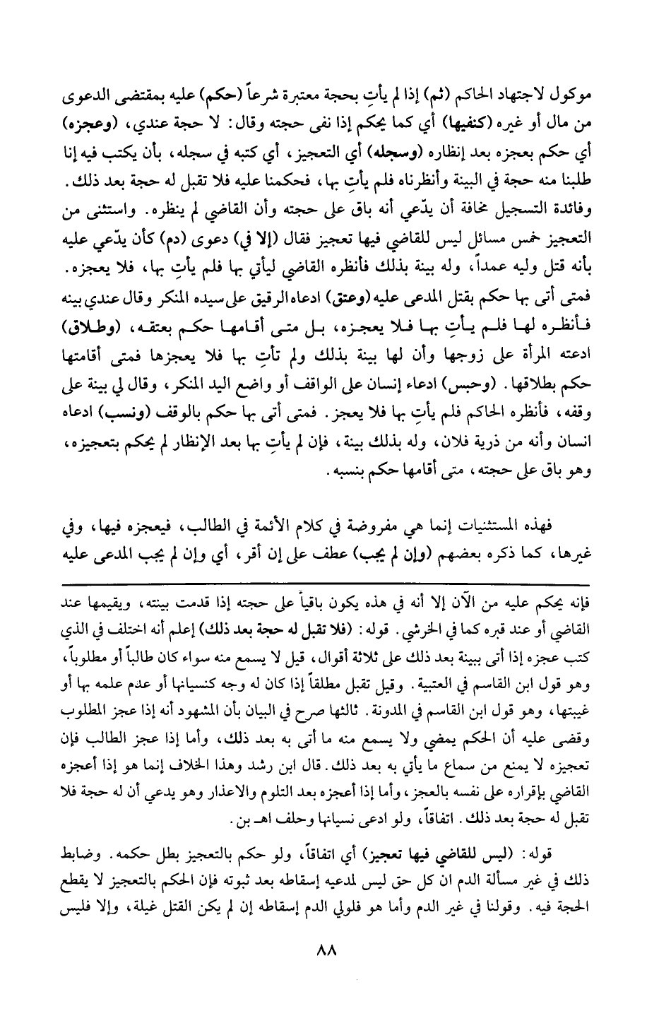 فإنه يحكم عليه من الآن إلا أنه في هذه يكون باقياً على حجته ، إذا قدمت بينته ويقيمها عند القاضي أو عند غيره كما في الخرشي . قوله : 16 ( فلا تقبل له حجة بعد ذلك ) : اعلم أنه اختلف في الذي كتب عجزه إذا أتى ببينة بعد ذلك على ثلاثة أقوال : قيل لا تسمع منه سواء كان طالباً أو مطلوباً وهو قول ابن القاسم في العتبية ، وقيل تقبل مطلقاً إذا كان له وجه كنسيانها أو عدم علمه بها أو غيبتها وهو قول ابن القاسم في المدونة . ) 16 ( ثالثها صرح في البيان بأن المشهور أنه إذا عجز المطلوب وقضى عليه أن الحكم يمضي ولا يسمع منه ما أتى به بعد ذلك ، وأما إذا عجز الطالب فإن تعجيزه لا يمنع من سماع ما أتى به بعد ذلك . قال ابن رشد وهذا الخلاف إنما إذا عجزه القاضي بإقراره على نفسه بالعجز ، وأما إذا عجزه القاضي بعد التلوم والإعذار وهو يدعي أن له حجة فلا تقبل له حجة بعد ذلك اتفاقاً ، و لو ادعى نسيانها و حلف ( ا هـ بن ) . قوله : 16 ( ليس للقاضي فيها تعجيز ) : أي اتفاقاً ولو حكم بالتعجيز بطل حكمه وضابط ذلك في غير مسألة الدم أن كل حق ليس لمدعيه إسقاطه بعد ثبوته ، فإن الحكم بالتعجيز لا يقطع الحجة فيه ، وقولنا في غير الدم ، و أما هو فلولى الدم إسقاطه إن لم يكن القتل غيلة و إلا فليس