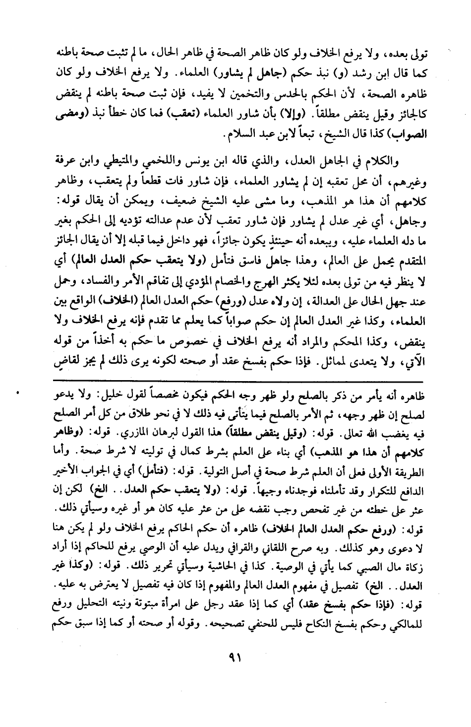 ظاهره أنه يأمر من ذكر بالصلح ولو ظهر وجه الحكم فيكون مخصصاً لقول خليل ، ولا يدعو لصلح إن ظهر وجهه ثم الأمر بالصلح فيمايتأتى فيه ذلك لا في نحو طلاق من كل أمر الصلح فيه يغضب الله تعالى . قوله : 16 ( وقيل ينقض مطلقاً ) : هذا القول لبهرام المازري . قوله : ) 16 ( 16 ( وظاهر كلامهم أن هذا هو المذهب ) : أي بناء على أن العلم شرط كمال في توليته لا شرط صحة ، وأما الطريقة الأولى فعلى أن العلم شرط صحة في أصل التولية . قوله : 16 ( فتأمل ) : أي في هذا الجواب الأخير الدافع للتكرار وقد تأملناه فوجدناه وجيهاً . قوله : 16 ( ولا يتعقب حكم العدل ) : الخ لكن إن عثر على خطئه من غير تفحص وجب نقضه على من عثر عليه كان هو أو غيره وسيأتي ذلك . قوله : 16 ( ورفع حكم العدل العالم الخلاف ) : ظاهره أن حكم الحاكم يرفع الخلاف ولو لم يكن هناك دعوى وهو كذلك ، وبه صرح اللقاني والقرافي ، ويدل عليه أن الوصي يرفع للحاكم إذا أراد زكاة مال الصبي كما في الوصية كذا في الحاشية وسيأتي تحرير ذلك . قوله : 16 ( وكذا غير العدل ) : الخ : تفصيل في مفهوم العدل العالم والمفهوم إذا كان فيه تفصيل لا يعترض به عليه . قوله : 6 ( فإذا حكم بفسخ عقد ) : أي كما إذا عقد رجل على امرأة مبتونة ونبته التحليل ورفع للمالكي وحكم بفسخ النكاح فليس للحنفي تصحيحه . قوله : 6 ( أو صحته ) : أي كما إذا سبق حكم