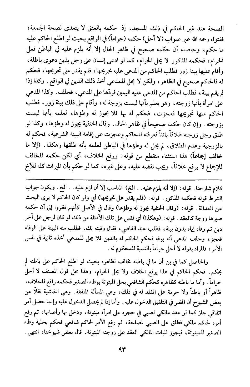 كلام شارحنا . قوله : 16 ( إلا أنه يلزم عليه ) الخ : المناسب إلا إن لزم الخ ويكون جواب الشرط قوله فحكمه المذكور . قوله : 16 ( وقال الحنفية يجوز له وطؤها ) : قال في الأصل كأنهم نظروا إلى أن حكمه صيرها زوجة كالعقد . قوله : 16 ( وهكذا ) : أي فقس على تلك الأمثلة من ذلك لو كان لرجل على آخر دين ثم وفاه إياه بدون بينة فطلبه عند القاضي فقال : وفيته لك فطلب منه القاضي البينة على الوفاء فعجز وحلف المدعى أنه لم يوفه فحكم الحاكم له بالدين فلا يحل للمدعى أخذه ثانية في نفس الأمر ؛ فالمراد بقوله : لا أحل حراماً بالنسبة للمحكوم له . والحاصل كما في ( بن ) أن ما باطنه مخالف لظاهره بحيث لو اطلع الحاكم على باطنه لم يحكم ، فحكم الحاكم في هذا يرفع الخلاف ولا يحل الحرام ، وهذا محمل قول المصنف : ) ) 16 ( 16 ( لا أحل حراماً وأما ما باطنه كظاهره كحكم الشافعي بحل المبتونة بوطء الصغير فحكمه رافع للخلاف ظاهراً وباطناً ولا حرمة على المقلد له في ذلك وهي المسألة الملفقة . وفي الحاشية نقلاً عن بعض الشيوخ : أن المضر في التلفيق الدخول عليه ، وأما إذا لم يحصل الدخول عليه وإنما حصل أمر اتفاقي جاز ، كما لو عقد مالكي لصبي في حجره على امرأة مبتونة ، ودخل بها وأصابها ثم رفع أمره لحاكم مالكي فطلق على الصبي لمصلحة ، ثم رفع الأمر لحاكم شافعي فحكم بحلِّية وطء الصغير للمبتونة فيجوز للبات المالكي العقد على زوجته المبتونة قاله بعض شيوخنا ( انتهى ) .