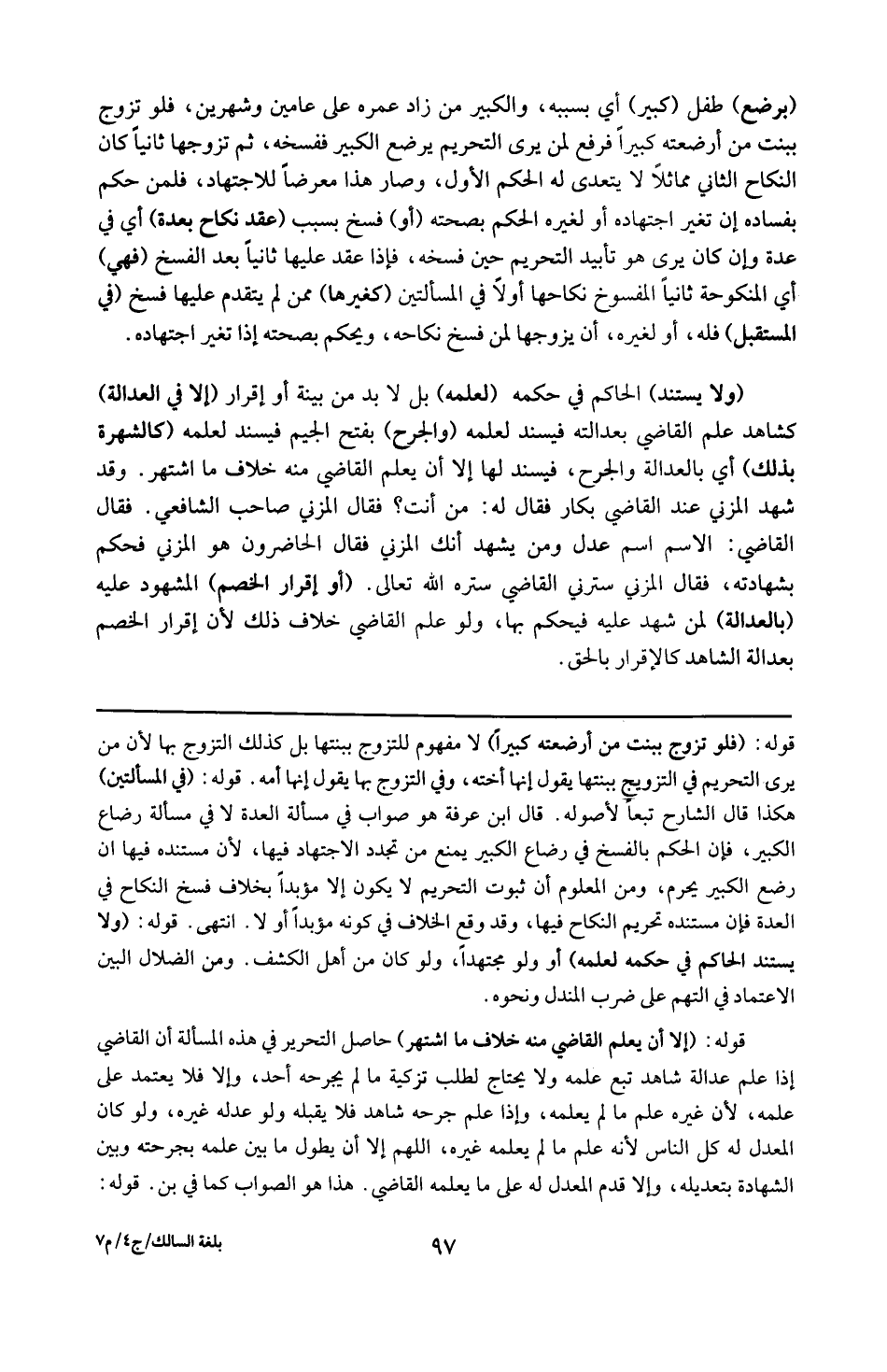 . قوله : 16 ( فلو تزوج ببنت من أرضعته كبيراً ) : لامفهوم بالتزوج ببنتها بل كذلك التزوج بها لأن من يرى التحريم في التزوج ببنتها يقول إنها أخته وفي التزوج بها يقول إنها أمه . قوله : 16 ( في المسألتين ) : هكذا قال الشارح تبعاً لأصوله قال ابن عرفة هذا هو صواب في مسألة العدة لا في مسألة رضاع الكبير فإن الحكم بالفسخ فيه رضاع الكبير يمنع من تجدد الاجتهاد فيها ؛ لأن مستنده فيها أن رضع الكبير يحرم ومن المعلوم أن ثبوت التحريم لا يكون إلا مؤبداً . بخلاف فسخ النكاح في العدة فإن مستنده تحريم النكاح فيها ، وقد وقع الخلاف في كونه مؤبداً أولا انتهى . قوله : 16 ( ولا يستند الحاكم في حكمه لعلمه ) أي ولو مجتهداً ولو كان من أهل الكشف ، ومن الضلال البين الاعتماد في التهم على ضرب المندل ونحوه . قوله : 16 ( إلا أن يعلم القاضي منه خلاف مااشتهر ) الخ : حاصل التحرير في هذه المسألة أن القاضي إذا علم عدالة شاهد تبع علمه ولايحتاج لطلب تزكية ما لم يجرحه أحد وإلا فلا يعتمد على علمه لأن غيره علم ما لم يعلمه وإذا علم جرحة شاهد فلا يقبله ولو عدَّله غيره ولو كان المعدل له كل الناس لأنه علم ما لم يعلمه غيره اللهم إلاأن يطول مابين علمه بجرحته وبين الشهادة بتعديله وإلا قدم المعدل له على ما يعلمه القاضي ، هذا هو الصواب كما في ( بن ) . قوله :