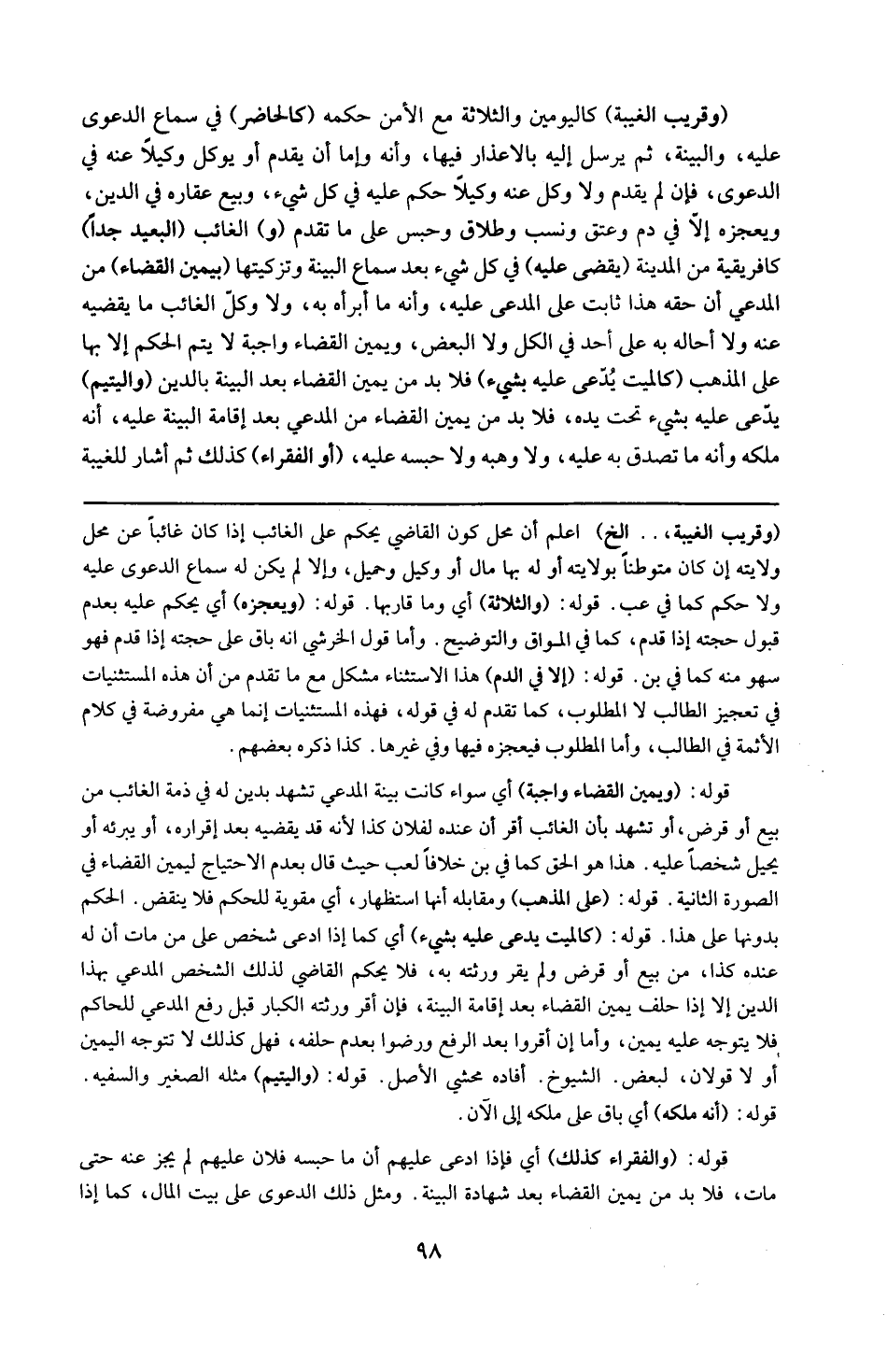 16 ( و قريب الغيبة ) الخ : اعلم أن محل كون القاضي يحكم على الغائب إذا كان غائباً عن محل ولايته إن كان متوطناً بولايته أو له بها مال أو وكيل أو حميل و إلا لم يكن له سماع الدعوى عليه ولا حكم كما في ( عب ) . قوله : 16 ( و الثلاثة ) : ) ) 16 ( 16 ( أي وما قاربها . قوله : 16 ( و يعجزه ) : أي يحكم عليه بعدم قبول حجته إذا قدم