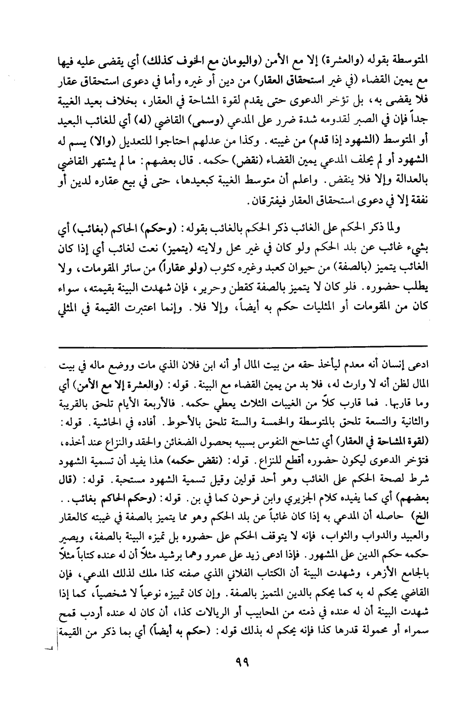 ادعى إنسان أنه معدم ليأخذ حقه من بيت المال أو أنه ابن فلان الذي مات ووضع ماله في بيت المال لظن أنه لا وارث له فلابد من يمين القضاء مع البينة . قوله : 16 ( والعشرة الأيام مع الأمن ) : أي و ما قاربها ، فما قارب كلاً من الغيبات الثلاث يعطى حكمه ، فالأربعة أيام تلحق بالقريبة و الثمانية و التسعة تلحق بالمتوسطة ، و الخمسة و الستة تلحق بالأحوط أفاده في الحاشية . قوله : 16 ( لقوة المشاحة في العقار ) : ) ) 16 ( 16 ( أي تشاحح النفوس بسببه و حصول الضغائن و الحقد و النزاع عند أخذه فتؤخر الدعوى ليكون حضوره أقطع للنزاع . قوله : 16 ( نقض حكمه ) : هذا يفيد أن تسمية الشهود شرط لصحة الحكم على الغائب وهو أحد قولين وقيل تسمية الشهود مستحبة .