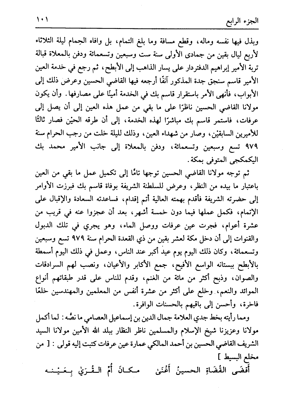 وبذل فِيهَا نَفسه وَمَاله وَقطع مَسَافَة وَمَا بلغ التَّمام بل وافاه الحِمام لَيْلَة الثُّلَاثَاء لأَرْبَع لَيَال بَقينَ من جُمَادَى الأولى سنة سِتّ وَسبعين وَتِسْعمِائَة وَدفن بالمعلاة قبالة تربة الْأَمِير إِبْرَاهِيم الدفتردار على يسَار الذَّاهِب إِلَى الأبطح ثمَّ رَجَعَ فِي خدمَة الْعين الْأَمِير قَاسم سنجق جدة الْمَذْكُور آنِفا أرجعه فِيهَا القَاضِي الْحُسَيْن وَعرض ذَلِك إِلَى الْأَبْوَاب فأنهى الْأَمر باستقرار قَاسم بك فِي الْخدمَة أَمينا على مصارفها وَأَن يكون مَوْلَانَا القَاضِي الْحُسَيْن نَاظرا على مَا بَقِي من عمل هَذِه الْعين إِلَى أَن يصل إِلَى عَرَفَات فاستمر قَاسم بك مباشراً لهَذِهِ الْخدمَة إِلَى أَن طرقه الْحِين فَصَارَ ثَالِثا للأميرين السَّابِقين وَصَارَ من شُهَدَاء الْعين وَذَلِكَ لليلة خلت من رَجَب الْحَرَام سنة 979 تسع وَسبعين وَتِسْعمِائَة وَدفن بالمعلاة إِلَى جَانب الْأَمِير مُحَمَّد بك اليكمكجي المتوفي بِمَكَّة ثمَّ توجه مَوْلَانَا القَاضِي الْحُسَيْن توجهاً تَاما إِلَى تَكْمِيل عمل مَا بَقِي من الْعين بِاعْتِبَار مَا بِيَدِهِ من النّظر وَعرض للسلطنة الشَّرِيفَة بوفاة قَاسم بك فبرزت الْأَوَامِر إِلَى حَضرته الشَّرِيفَة فأقدم بهمته الْعَالِيَة أتم إقدام فساعدته السَّعَادَة والإقبال على الْإِتْمَام فكمل عَملهَا فِيهَا دون خَمْسَة أشهر بعد أَن عجزوا عَنهُ فِي قريب من عشرَة أَعْوَام فجرت عين عَرَفَات وَوصل المَاء وَهُوَ يجْرِي فِي تِلْكَ الدبول والقنوات إِلَى أَن دخل مَكَّة لعشر بَقينَ من ذِي الْقعدَة الْحَرَام سنة 979 تسع وَسبعين وَتِسْعمِائَة وَكَانَ ذَلِك الْيَوْم يَوْم عيد أكبر عِنْد النَّاس وَعمل فِي ذَلِك الْيَوْم أسمطة بِالْأَبْطح ببستانه الْوَاسِع الأفيح جمع الأكابر والأعيان وَنصب لَهُم السرادقات والصوان وَذبح أَكثر من مائَة من الْغنم وَقدم للنَّاس على قدر طبقاتهم أَنْوَاع الموائد وَالنعَم وخلع على أَكثر من عشرَة أنفس من المعلمين والمهندسين خلعاً فاخرة وَأحسن إِلَى باقيهم بِالْحَسَنَاتِ الوافرة وَمِمَّا رَأَيْته بِخَط جدي الْعَلامَة جمال الدّين بن إِسْمَاعِيل العصامي مَا نصُّه لما أكمل مَوْلَانَا وعزيزنا شيخ الْإِسْلَام وَالْمُسْلِمين نَاظر النظار بِبَلَد الله الْأمين مَوْلَانَا السَّيِّد الشريف القَاضِي الْحُسَيْن بن أَحْمد الْمَالِكِي عمَارَة عين عَرَفَات كتبت إِلَيْهِ قولى // (من مخلع الْبَسِيط) //