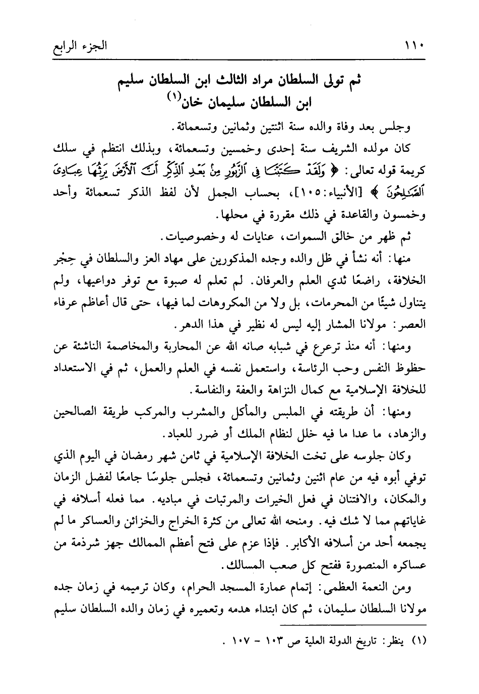 وَجلسَ بعد وَفَاة وَالِده سنة اثْنَتَيْنِ وَثَمَانِينَ وَتِسْعمِائَة كَانَ مولده الشريف سنة إِحْدَى وَخمسين وَتِسْعمِائَة وَبِذَلِك انتظم فِي سلك كَرِيمَة قَوْله تَعَالَى {وَلَقَد كَتَبنا فِي اَلزبور مِن بَعدِ اَلذِكِر أَن الأَرْض يَرِثهَا عبادى الصلحون} الْأَنْبِيَاء 105 بِحِسَاب الْجمل لِأَن لفظ الذّكر تِسْعمائَة وَأحد وَخَمْسُونَ وَالْقَاعِدَة فِي ذَلِك مقررة فِي محلهَا ثمَّ ظهر من خَالق السَّمَوَات عنايات لَهُ وخصوصيات مِنْهَا أَنه نَشأ فِي ظلّ وَالِده وجده الْمَذْكُورين على مهاد الْعِزّ وَالسُّلْطَان فِي حِجْر الْخلَافَة راضعاً ثدي الْعلم والعرفان لم تعلم لَهُ صبوة مَعَ توفر دواعيها وَلم يتَنَاوَل شَيْئا من الْمُحرمَات بل وَلَا من المكروهات لما فِيهَا حَتَّى قَالَ أعاظم عرفاء الْعَصْر مَوْلَانَا الْمشَار إِلَيْهِ لَيْسَ لَهُ نَظِير فِي هَذَا الدَّهْر وَمِنْهَا أَنه مُنْذُ ترعرع فِي شبابه صانه الله عَن الْمُحَاربَة والمخاصمة الناشئة عَن حظوظ النَّفس وَحب الرِّئَاسَة وَاسْتعْمل نَفسه فِي الْعلم وَالْعَمَل ثمَّ فِي الاستعداد للخلافة الإسلامية مَعَ كَمَال النزاهة والعفة والنفاسة وَمِنْهَا أَن طَرِيقَته فِي الملبس والمأكل وَالْمشْرَب والمركب طَريقَة الصَّالِحين والزهاد مَا عدا مَا فِيهِ خلل لنظام الْملك أَو ضَرَر للعباد وَكَانَ جُلُوسه على تخت الْخلَافَة الإسلامية فِي ثامن شهر رَمَضَان فِي الْيَوْم الَّذِي توفّي أَبوهُ فِيهِ من عَام اثْنَيْنِ وَثَمَانِينَ وَتِسْعمِائَة فَجَلَسَ جُلُوسًا جَامعا لفضل الزَّمَان وَالْمَكَان والافتنان فِي فعل الْخيرَات والمرتبات فِي مباديه مِمَّا فعله أسلافه فِي غاياتهم مِمَّا لَا شكّ فِيهِ ومنحه الله تَعَالَى من كَثْرَة الْخراج والخزائن والعساكر مَا لم يجمعه أحد من أسلافه الأكابر فَإِذا عزم على فتح أعظم الممالك جهز شرذمة من عساكره المنصورة فَفتح كل صَعب المسالك وَمن النِّعْمَة الْعُظْمَى إتْمَام عمَارَة الْمَسْجِد الْحَرَام وَكَانَ ترميمه فِي زمَان جده مَوْلَانَا السُّلْطَان سُلَيْمَان ثمَّ كَانَ ابْتِدَاء هَدمه وتعميره فِي زمَان وَالِده السُّلْطَان سليم
