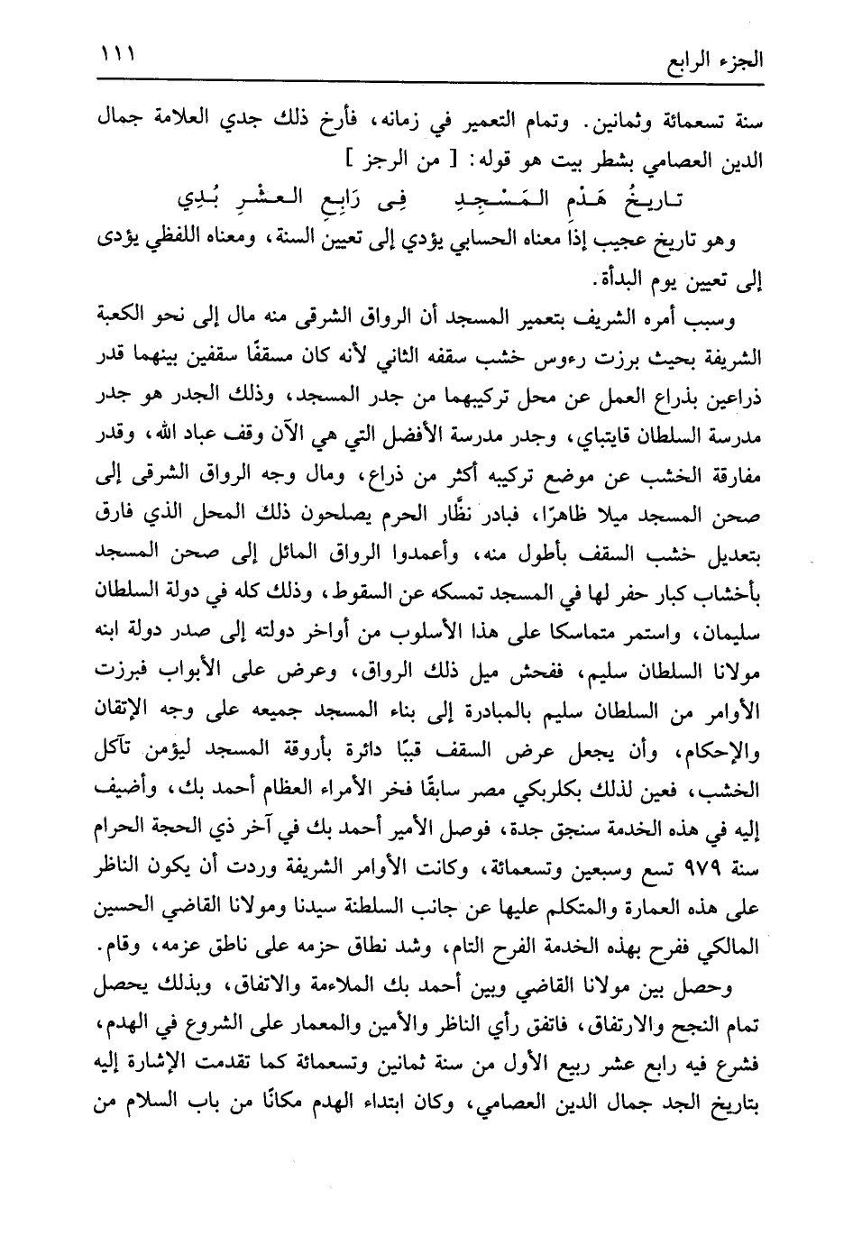 وَهُوَ تَارِيخ عَجِيب إِذا مَعْنَاهُ الحسابي يُؤَدِّي إِلَى تعْيين السّنة وَمَعْنَاهُ اللَّفْظِيّ يُؤَدِّي إِلَى تعْيين يَوْم البدأة وَسبب أمره الشريف بتعمير الْمَسْجِد أَن الرواق الشَّرْقِي مِنْهُ مَال إِلَى نَحْو الْكَعْبَة الشَّرِيفَة بِحَيْثُ برزت رُءُوس خشب سقفه الثَّانِي لِأَنَّهُ كَانَ مسقفاً سقفين بَينهمَا قدر ذراعين بِذِرَاع الْعَمَل عَن مَحل تركيبهما من جدر الْمَسْجِد وَذَلِكَ الْجدر هُوَ جدر مدرسة ألسلطان قايتباي وجدر مدرسة الْأَفْضَل الَّتِي هِيَ الْآن وقف عباد الله وَقدر مُفَارقَة الْخشب عَن مَوضِع تركيبه أَكثر من ذِرَاع وَمَال وَجه الرواق الشَّرْقِي إِلَى صحن الْمَسْجِد ميلًا ظَاهرا فبادر نظار الْحرم يصلحون ذَلِك الْمحل الَّذِي فَارق بتعديل خشب السّقف بأطول مِنْهُ وأعمدوا الرواق المائل إِلَى صحن الْمَسْجِد بأخشاب كبار حفر لَهَا فِي الْمَسْجِد تمسكه عَن السُّقُوط وَذَلِكَ كُله فِي دولة السُّلْطَان سُلَيْمَان وَاسْتمرّ متماسكاً على هَذَا الأسلوب من أَوَاخِر دولته إِلَى صدر دولة ابْنه مَوْلَانَا السُّلْطَان سليم ففحش ميل ذَلِك الرواق وَعرض على الْأَبْوَاب فبرزت الْأَوَامِر من السُّلْطَان سليم بالمبادرة إِلَى بِنَاء الْمَسْجِد جَمِيعه على وَجه الإتقان والإحكام وَأَن يَجْعَل عرض السّقف قبباً دَائِرَة بأروقة الْمَسْجِد ليؤمن تآكل الْخشب فعين لذَلِك بكلربكي مصر سَابِقًا فَخر الْأُمَرَاء الْعِظَام أَحْمد بك وأضيف إِلَيْهِ فِي هَذِه الْخدمَة سنجق جدة فوصل الْأَمِير أَحْمد بك فِي آخر ذِي الْحجَّة الْحَرَام سنة 979 تسع وَسبعين وَتِسْعمِائَة وَكَانَت الْأَوَامِر الشَّرِيفَة وَردت أَن يكون النَّاظر على هَذِه الْعِمَارَة والمتكلم عَلَيْهَا عَن جَانب السلطنة سيدنَا ومولانا القَاضِي الْحُسَيْن الْمَالِكِي ففرح بِهَذِهِ الْخدمَة الْفَرح التَّام وَشد نطاق حزمه على نَاطِق عزمه وَقَامَ وَحصل بَين مَوْلَانَا القَاضِي وَبَين أَحْمد بك الملاءمة والاتفاق وَبِذَلِك يحصل تَمام النجح والارتفاق فاتفق رَأْي النَّاظر والأمين والمعمار على الشُّرُوع فِي الْهدم فشرع فِيهِ رَابِع عشر ربيع الأول من سنة ثَمَانِينَ وَتِسْعمِائَة كَمَا تقدّمت الْإِشَارَة إِلَيْهِ بتاريخ الْجد جمال الدّين العصامي وَكَانَ ابْتِدَاء الْهدم مَكَانا من بَاب السَّلَام من
