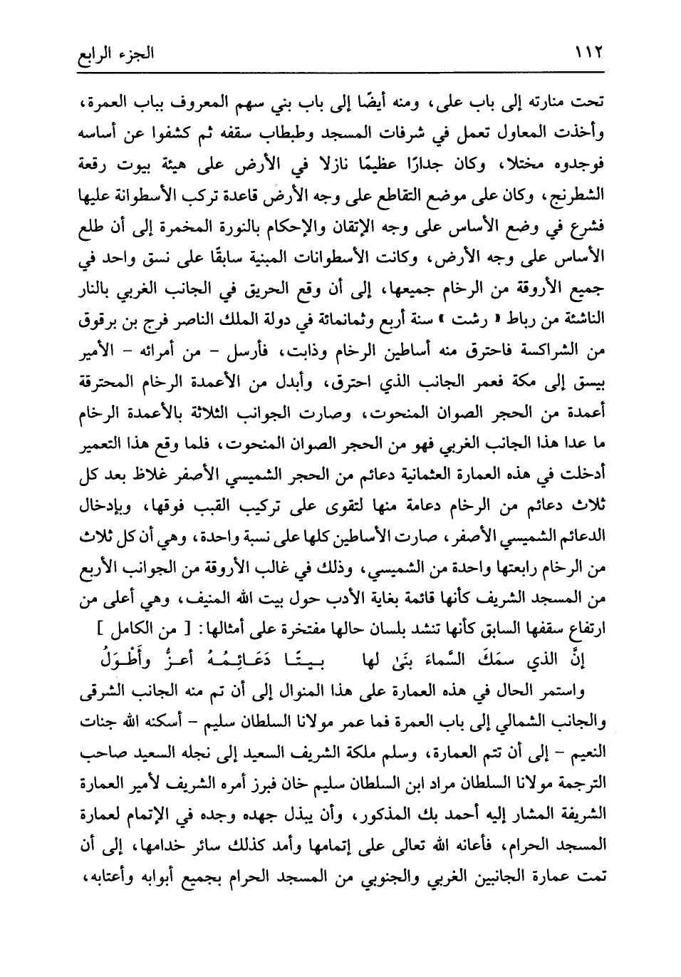 وَاسْتمرّ الْحَال فِي هَذِه الْعِمَارَة على هَذَا المنوال إِلَى أَن تمّ مِنْهُ الْجَانِب الشَّرْقِي والجانب الشمالي إِلَى بَاب الْعمرَة فَمَا عمر مَوْلَانَا السُّلْطَان سليم أسْكنهُ الله جنَّات النَّعيم إِلَى أَن تتمّ الْعِمَارَة وَسلم ملكة الشريف السعيد إِلَى نجله السعيد صَاحب التَّرْجَمَة مَوْلَانَا السُّلْطَان مُرَاد ابْن السُّلْطَان سليم خَان فبرز أمره الشريف لأمير الْعِمَارَة الشَّرِيفَة الْمشَار إِلَيْهِ أَحْمد بك الْمَذْكُور وَأَن يبْذل جهده وجده فِي الْإِتْمَام لعمارة الْمَسْجِد الْحَرَام فأعانه الله تَعَالَى على إِتْمَامهَا وأمد كَذَلِك سَائِر خدامها إِلَى أَن تمت عمَارَة الْجَانِبَيْنِ الغربي والجنوبي من الْمَسْجِد الْحَرَام بِجَمِيعِ أبوابه وأعتابه
